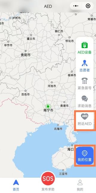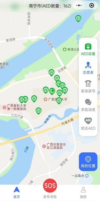 作为第二批全国学校急救教育试点学校,我校负责绘制了广西AED急救地图,社会大众可以第一时间在手机上查询到离自己最近的AED设备存放地点。