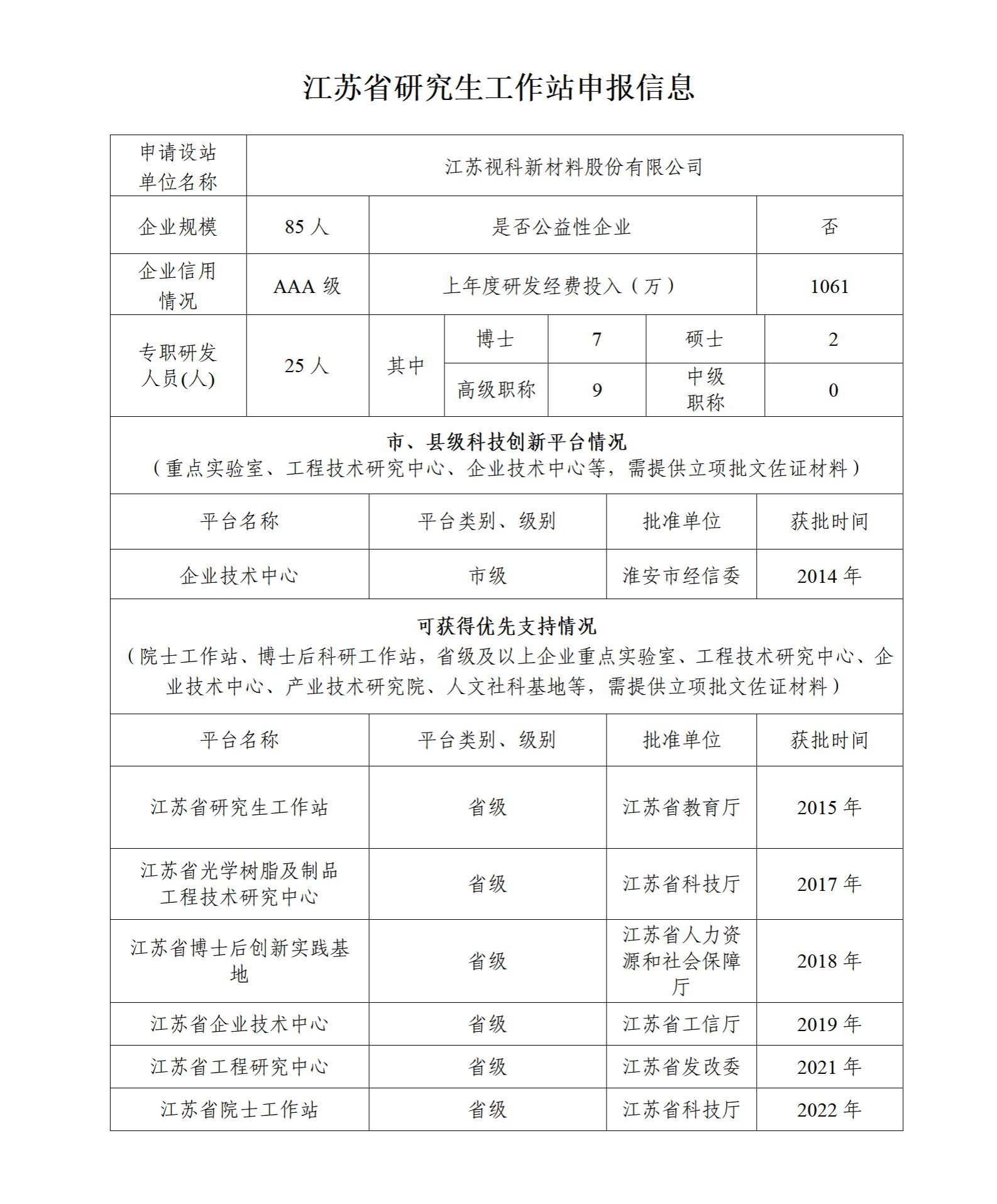 拟推荐江苏视科新材料股份有限公司参加江苏省研究生工作站申请,公示日期:2024年6月21日至2024年6月27日。