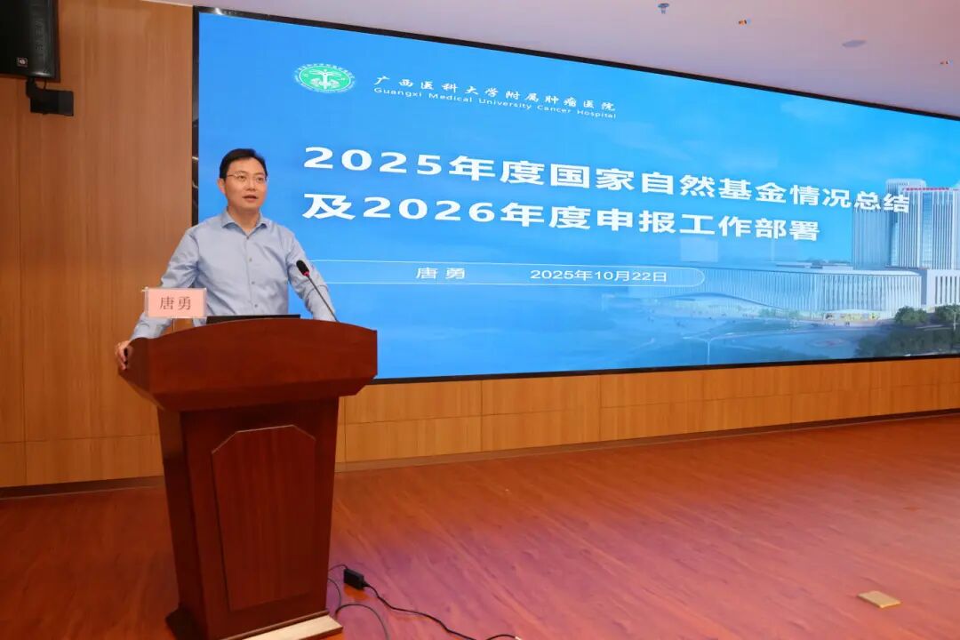 为推进2026年度国家自然科学基金申报工作,深入解读基金政策与评审规则,提升科研人员项目设计与申请书撰写水平,10月22日下午,附属肿瘤医院在五象院区学术报告厅召开2025年国家自然科学基金工作总结暨2026年申报动员部署会(第十三期求索学术论坛)。院长唐勇作动员部署,会议特邀天津医科大学冯玉宽教授、空军军医大学黄启超教授作专题授课。各科室主任、学科带头人、中青年骨干及博士、博士后参会,副院长余红平主持会议。