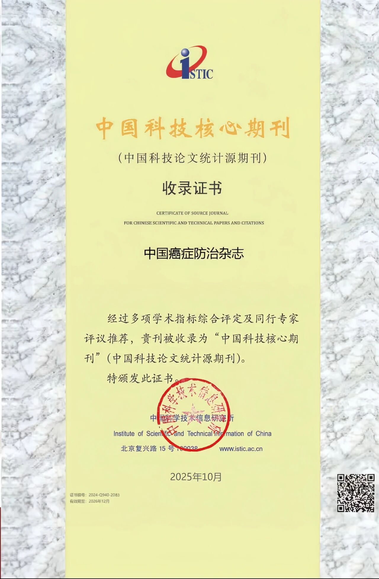 中国科技核心期刊(中国科技论文统计源期刊)是中国科学技术信息研究所(ISTIC)受科技部委托,在经过严格的定量和定性分析的基础上选取的各个学科的重要科技期刊,是评价科技期刊及其论文学术地位和影响力的一个重要依据。连续8年入选,彰显了《中国癌症防治杂志》的学术影响力与办刊质量在国内权威评价体系中获得的持续肯定。