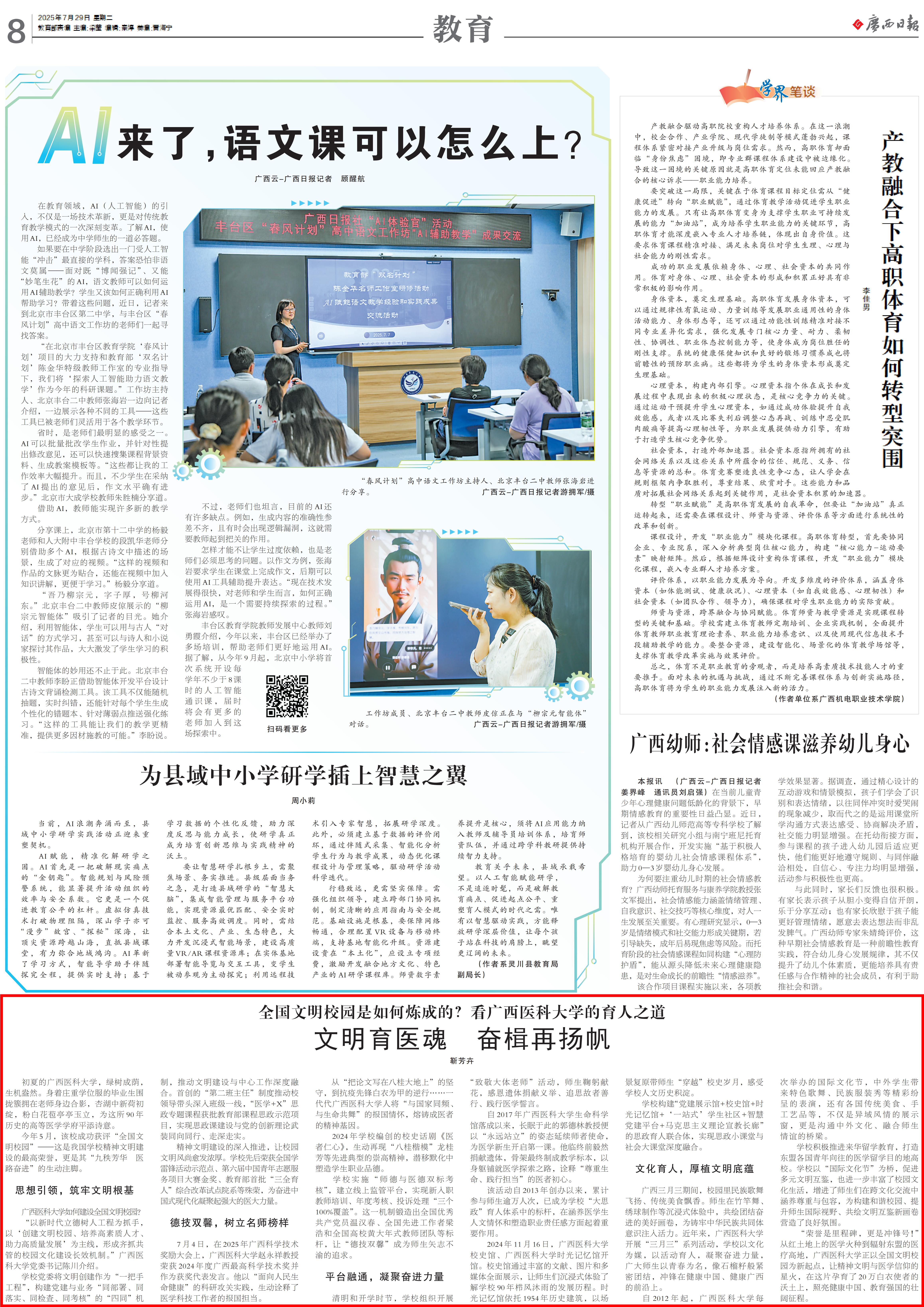 2025年7月29日,《广西日报》第8版以《文明育医魂 奋楫再扬帆:全国文明校园是如何炼成的?看广西医科大学的育人之道》为题,从“思想引领,筑牢文明根基”“德技双馨,树立名师榜样”“平台融通,凝聚奋进力量”“文化育人,厚植文明底蕴”等方面阐述了学校扎实推进全国文明校园创建,全校师生共创共享文明校园的生动实践。学校正以全国文明校园为新起点,让精神文明与医学信仰的星火,在这片孕育了20万白衣使者的沃土上,照亮健康中国、教育强国的壮阔征程。