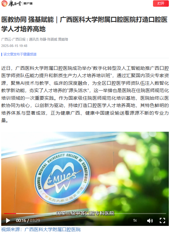 8月15日,广西日报广西云以《医教协同 强基赋能|广西医科大学附属口腔医院打造口腔医学人才培养高地》为题对医院相关工作作了专题报道。