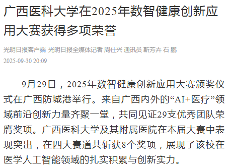 9月29日,光明日报客户端、光明网、广西日报报道我校在2025年数智健康创新应用大赛获得多项荣誉。
