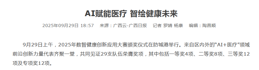 9月29日,2025年数智健康创新应用大赛颁奖仪式在广西防城港举行。来自广西内外的“AI+医疗”领域前沿创新力量齐聚一堂,共同见证29支优秀团队荣膺奖项。广西医科大学及其附属医院在本届大赛中表现突出,在四大赛道共斩获8个奖项,展现了该校在医学人工智能领域的扎实积累与创新实力。