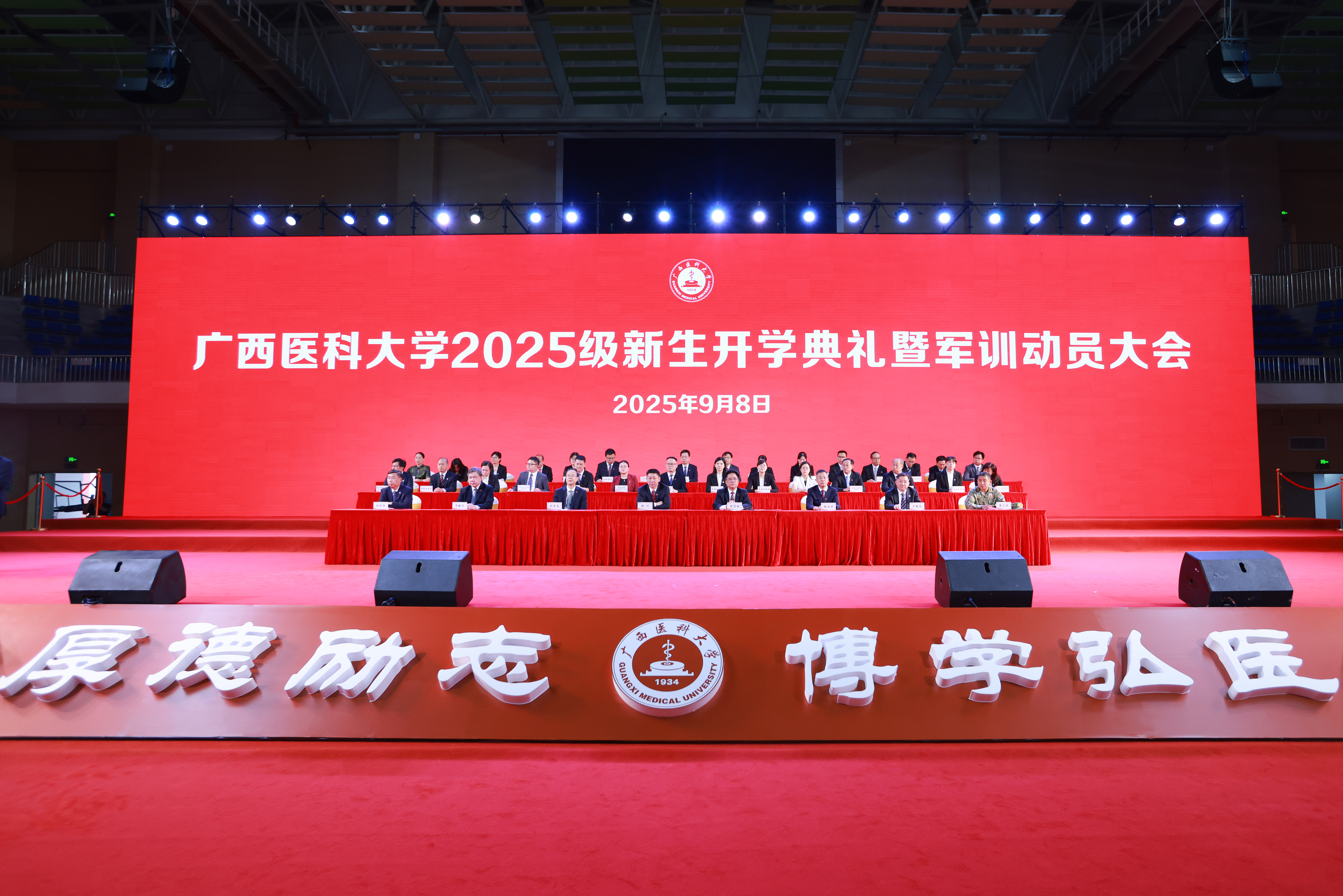 秋风送爽桂盈枝,恰是青年立志时。9月8日上午,广西医科大学2025级新生开学典礼暨军训动员大会在南宁-武鸣校区体育馆举行。校党委书记陈川、校长曾志羽等校领导,校内有关部(处)、二级学院领导,2025级新生辅导员(班主任),2025级武鸣校区全体本科、高职新生,2025级校本部专升本学生(线上),2025级玉林校区本科、高职新生(线上)参加典礼。典礼由副校长陈俊强主持。