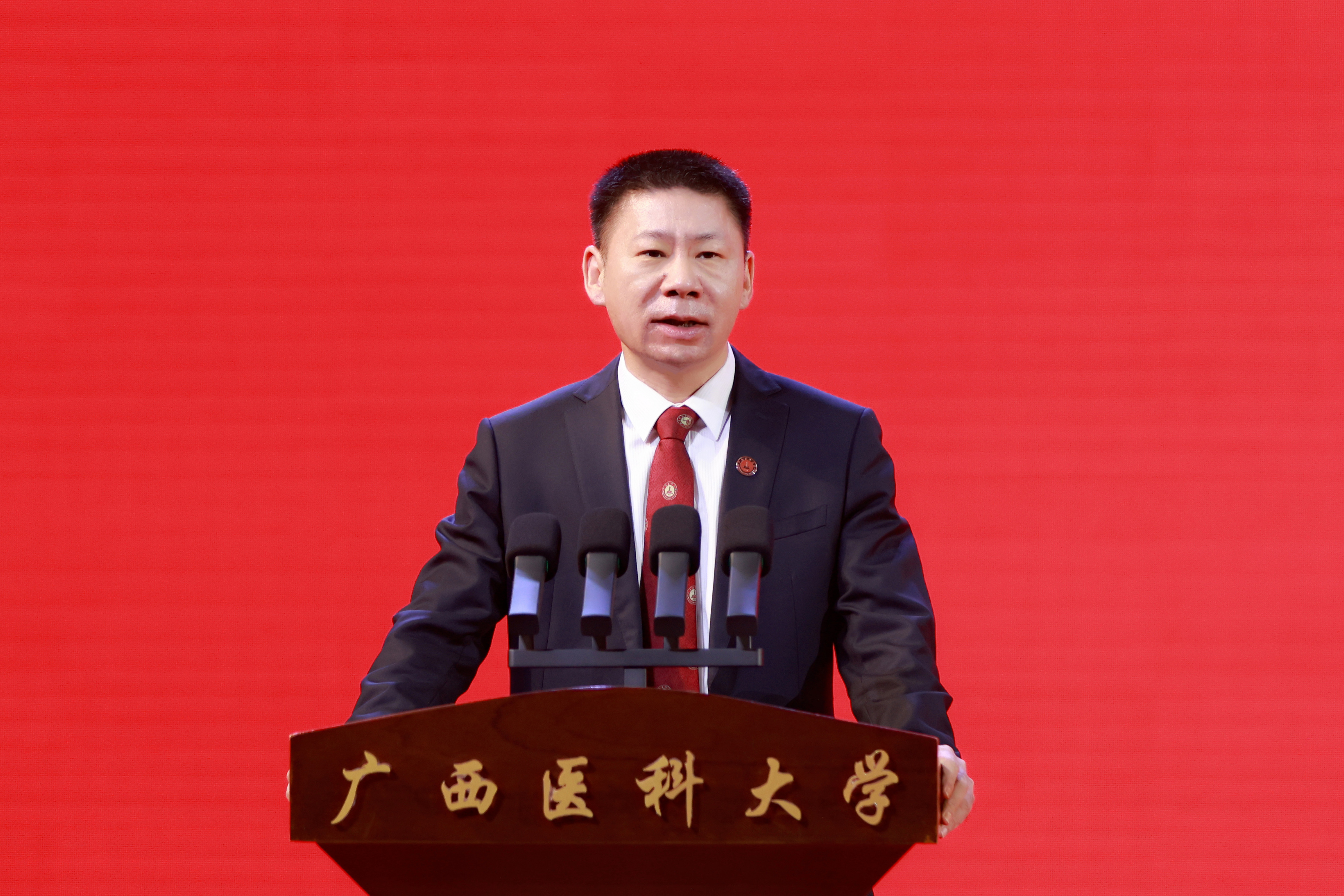 基础医学院2025级五年制临床医学专业陆思凤同学作为新生代表发言,她分享了冲破逆境,在关爱中坚定学医初心的故事,希望能成为一个“提灯者”,表示将以“有志者,事竟成”为信念之火,铭记“医海无涯爱作舟”,厚植仁爱之心,扎实专业知识,在守护人民健康的伟大事业中贡献青春力量;第二临床医学院2022级临床医学专业容万乐同学作为在校生代表发言,他分享了对“医者”二字的理解,鼓励新同学存初心、怀仁心、磨匠心,在传承中创新,在磨砺中成长,最终成为既有扎实功底、又有开拓精神的卓越医学人才;武鸣临床医学院院长张剑锋教授作为教师代表发言,他回顾从医之路,勉励同学们铭记学医初心,保持善良和热爱,保持健康体魄,把医学作为终生事业来追求,将青春奋斗融入医疗卫生发展的新征程,在护佑人民健康、建设健康中国中贡献青春力量。