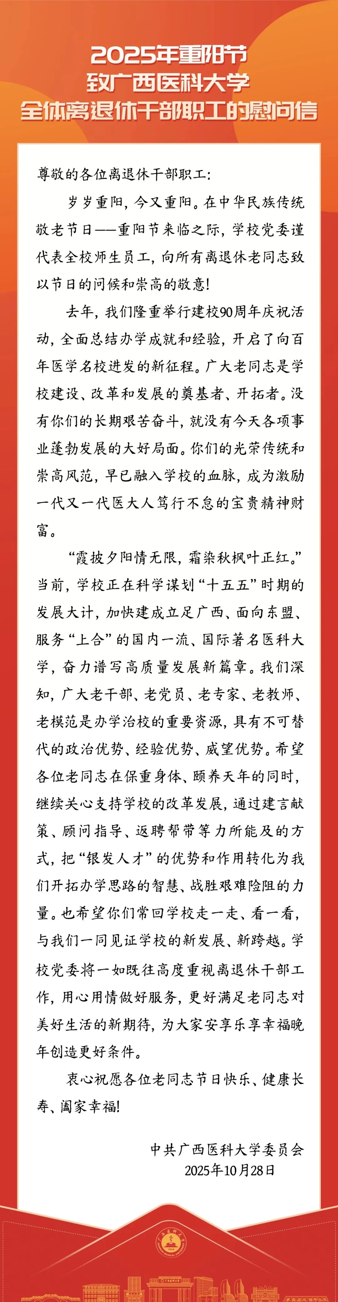 2025年重阳节致广西医科大学全体离退休干部职工的慰问信