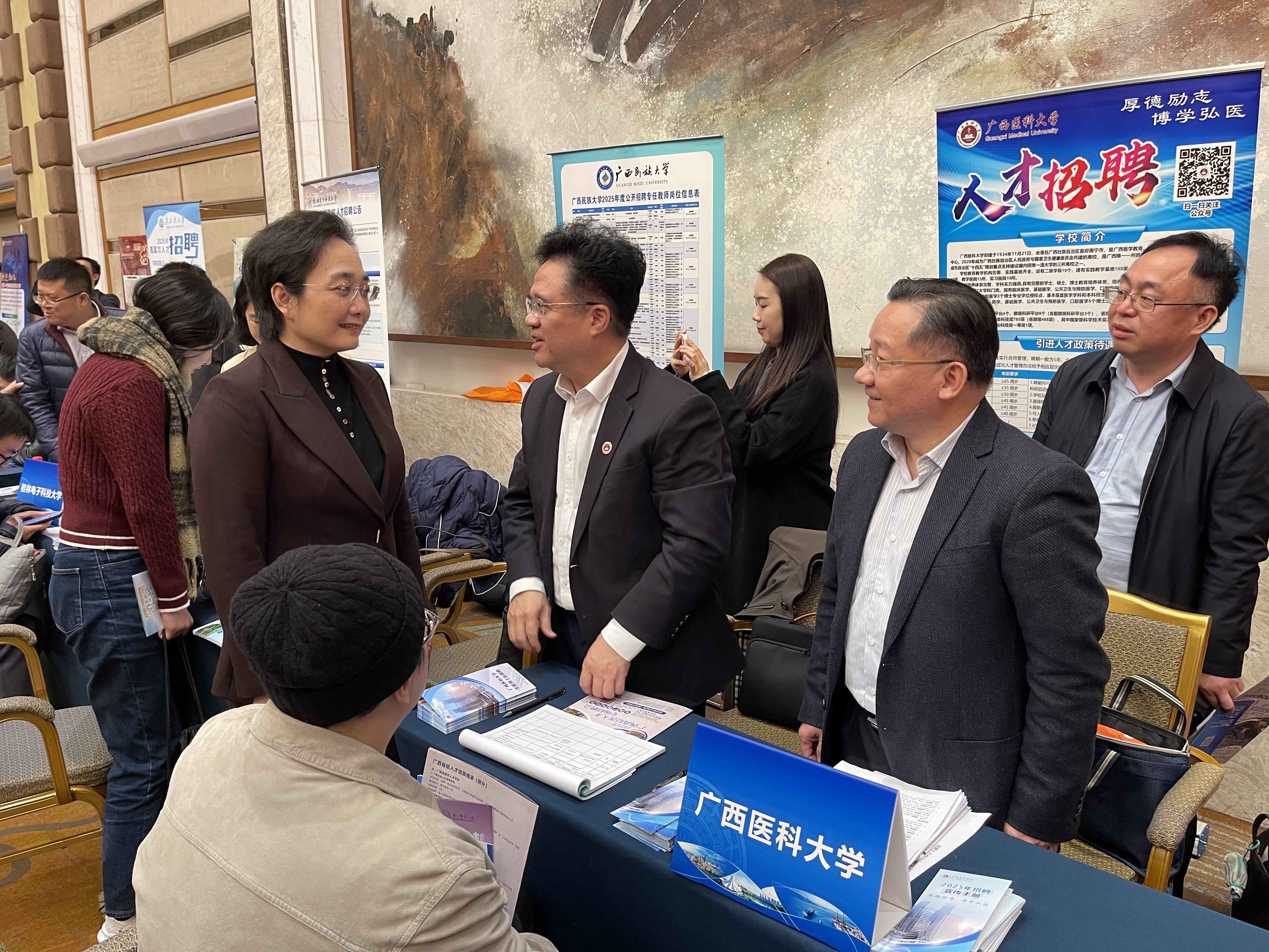 在招聘会现场,曾志羽与前来咨询学生亲切交流,详细介绍我校的教学科研平台、办学成果、人才政策、软硬件保障与发展目标,关切询问学生的专业背景与就业意向,针对学生们关心的学习、生活、工作环境及福利待遇等问题,一一作出细致解答。他还与现场交流的学生互留联系方式,诚挚邀请大家加入广西医科大学,特别与广西籍学子畅谈家乡发展新态势,鼓励他们投身家乡建设,为广西经济社会发展和健康广西建设贡献力量。