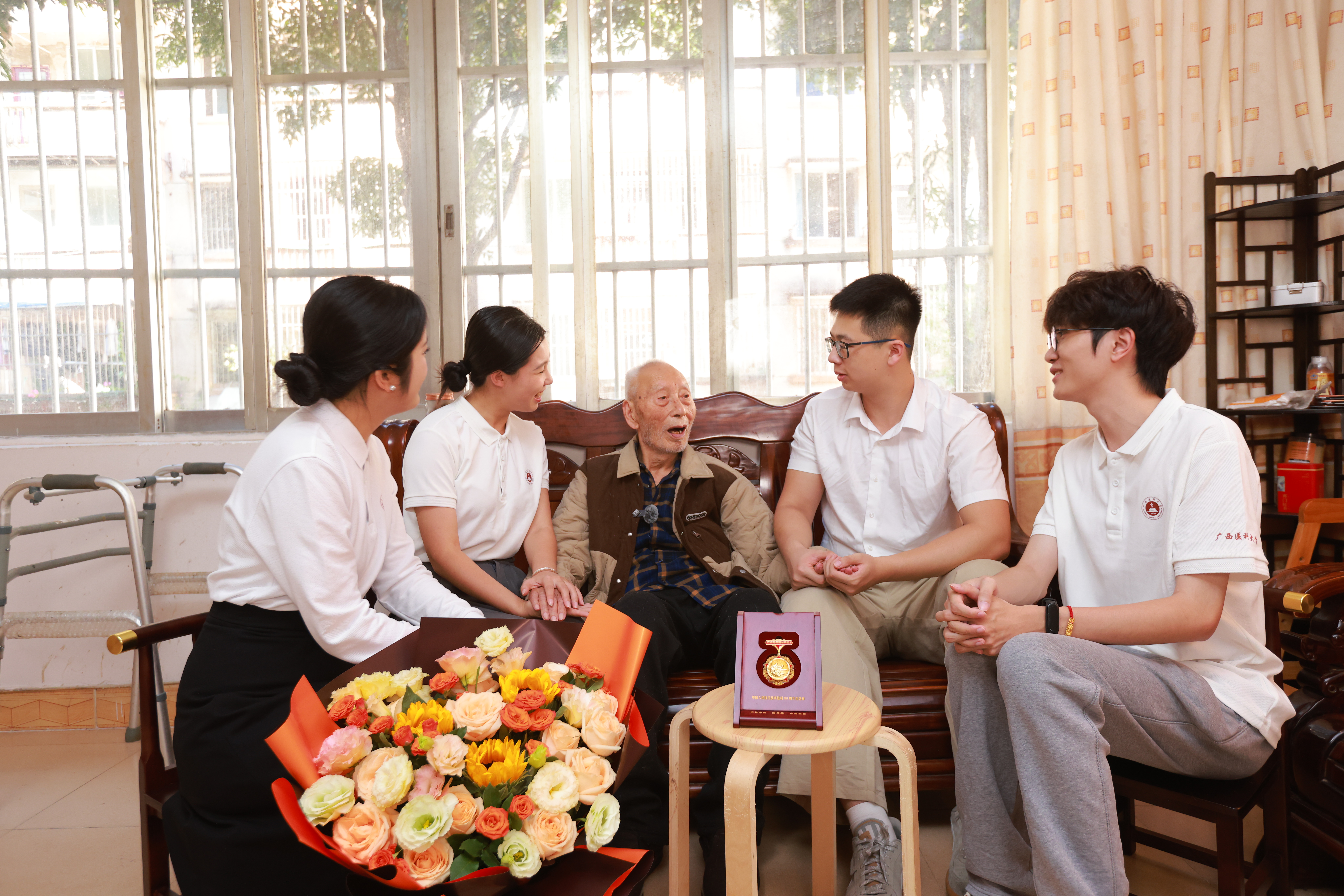 今年是纪念中国人民抗日战争暨世界反法西斯战争胜利80周年,恰逢重阳佳节到来,为传承红色基因、厚植敬老情怀,2025年10月27日下午,由学校宣传部主办的“重阳话峥嵘 青春续华章”重阳节主题活动在校本部八桂书苑举行。学校研究生、大学生新媒体中心成员及附属小学学生代表齐聚一堂,共赴这场跨越时空的红色之约。