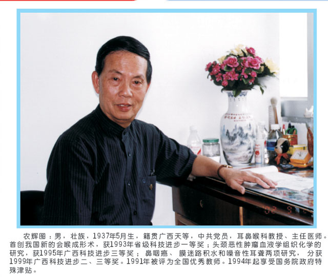 农辉图 男,壮族,广西天等县人,中共党员,学士学位,广西医科大学耳鼻咽喉科学教研室,教授,硕士导师。1994年获享受国务院政府津贴专家。曾任广西医科大学第一临床医学院耳鼻咽喉头颈外科主任、中华医学会耳鼻咽喉头颈外科分会委员、中华医学会耳鼻咽喉头颈外科分会广西分会主任委员,6家专业核心期刊编委。曾获全国边远地区优秀科技工作者,全国优秀教师、广西壮族自治区劳动模范、国家边远地区先进科技工作者。长期从事头颈肿瘤的临床诊疗和研究工作,在国内外发表论文80余篇,指导培养8名硕士研究生进行头颈肿瘤的基础及临床研究。在喉癌、鼻咽癌方面的研究成果辉煌,学术水平达到领先水平及国际先进。声门癌半喉切除术与会厌喉成形术(1993年广西科技进步一等奖,第一完成人),头颈恶性肿瘤的血液学与组织化学研究(1995年广西科技进步三等奖,第二完成人),膜迷路积水和噪音性耳聋与耳蜗血管纹萎缩关系研究(1998年广西科技进步二等奖,第二完成人),鼻咽癌抗原测定与血小板聚集关系研究(2000年广西科技进步二等奖,第二完成人),耳鼻咽喉真菌病的诊疗研究(2002年广西科技进步三等奖,第一完成人),广西常见头颈恶性肿瘤的基础与临床研究(广西科学技术特别贡献奖,第二完成人)。主编《耳鼻咽喉腔内检查法》教学录像片、《耳鼻咽喉科学实用教程》等高校教材及教学辅助材料。先后获得国家教委、区教育厅、全国高校优秀教材奖4项。参编出版《喉癌下咽癌现代理论与临床》、《实用耳鼻咽喉临床诊疗学》等专著。医技精湛,创新了喉癌会厌喉成形术,代表作被SCI收录。专注学科建设,积极与国外院校交流,委派人员赴国外学习或攻读学位,学成归国多人,现已成为学科栋梁。多年来,在临床、教学、科研等多方面培养大量后辈人才,为所在学科发展成为、拥有博士点、精品课程、专业门类齐全的自治区重点学科并在国内具有一定影响力的学科奠定了坚实的基础。