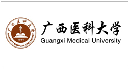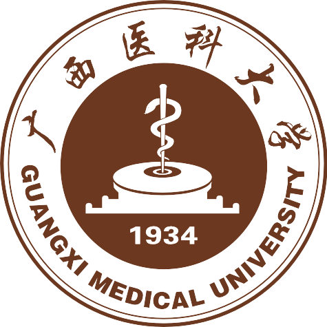 广西医科大学校徽,形状为圆形,中间为象征医神的蛇杖、象征时光的日暑和学校创办时间1934等元素,中文楷体广西医科大学围绕上半圆,英文黑体GUANGXI MEDICAL UNIVERSITY围绕下半圆,底色为金黄色。