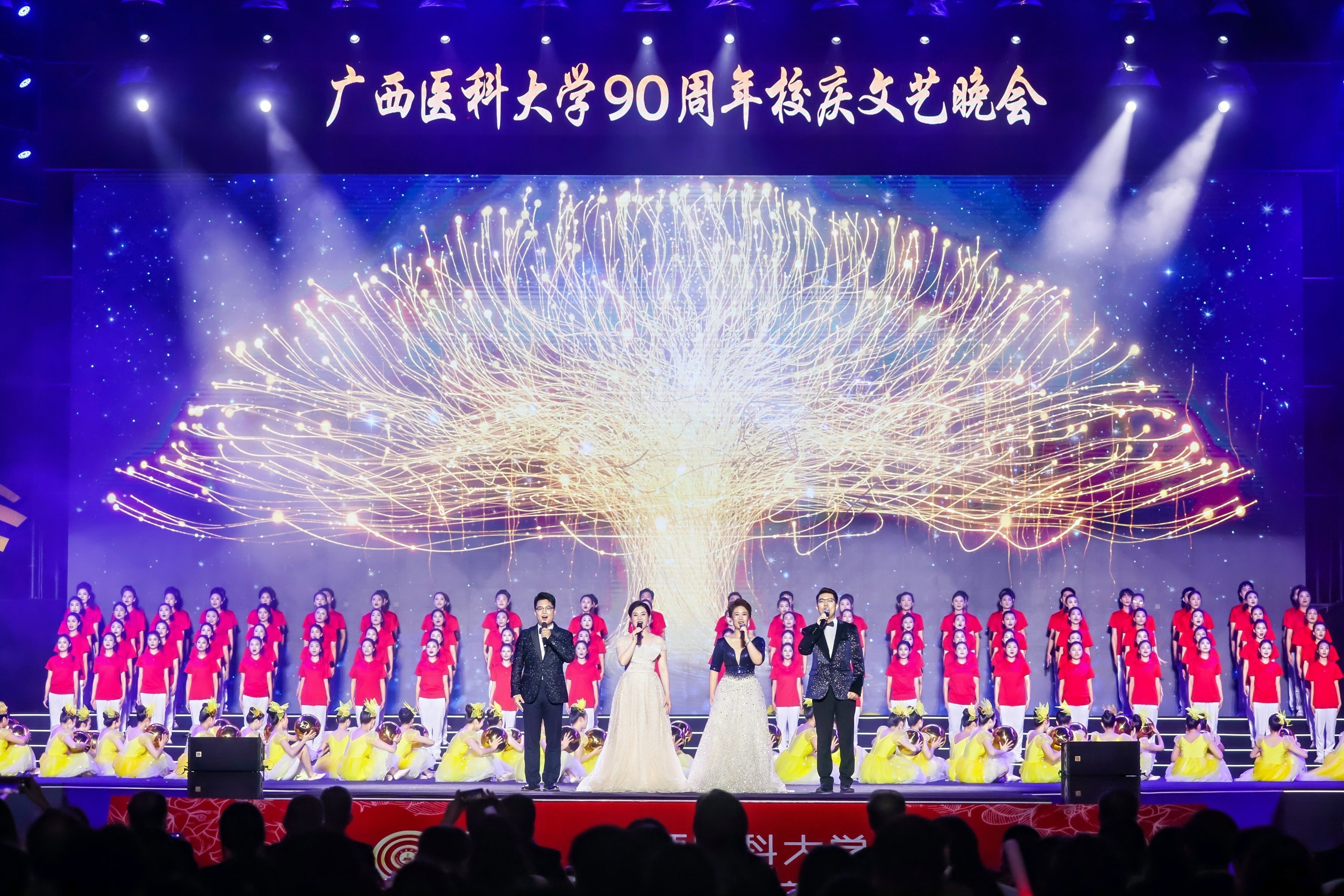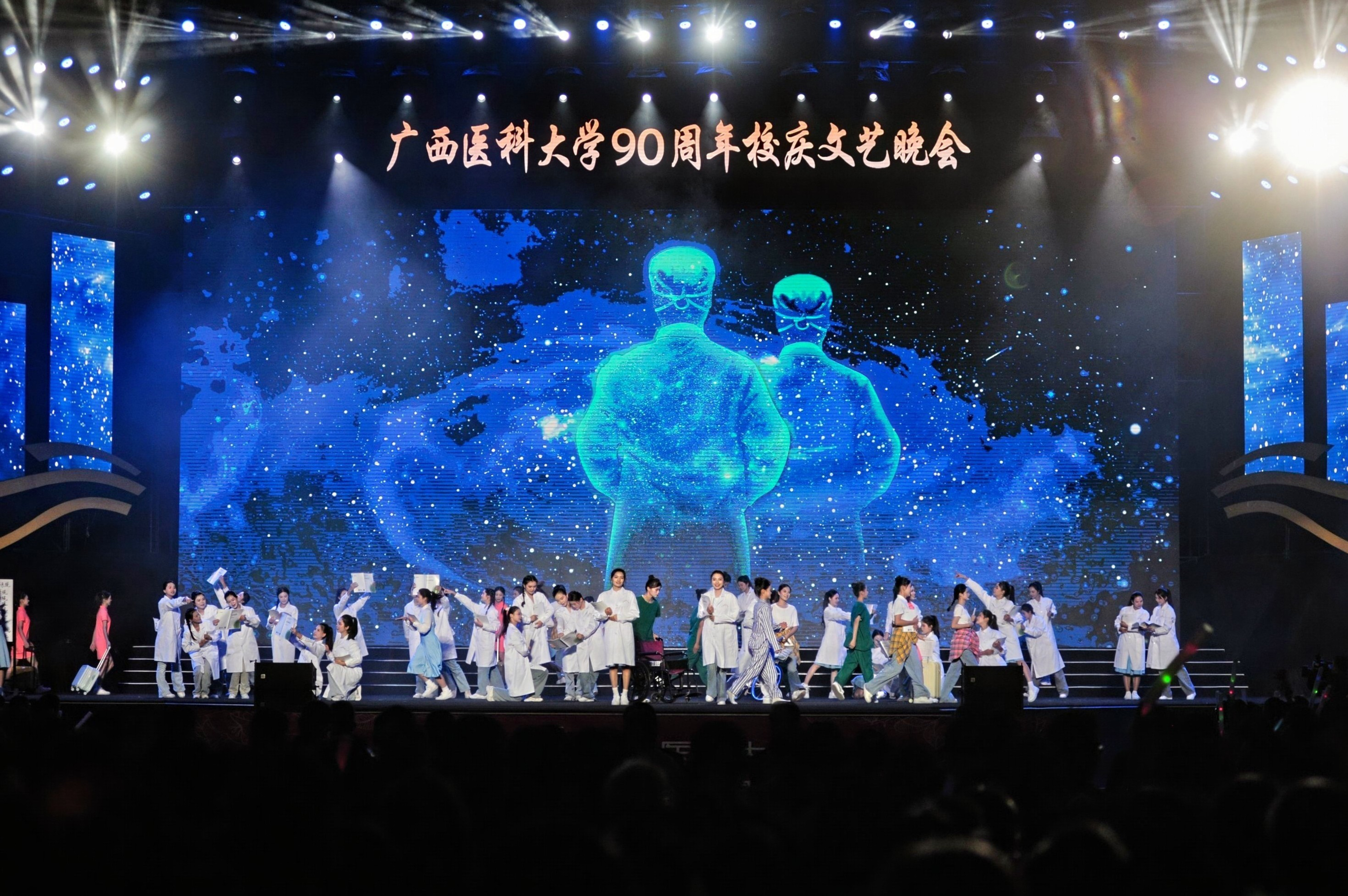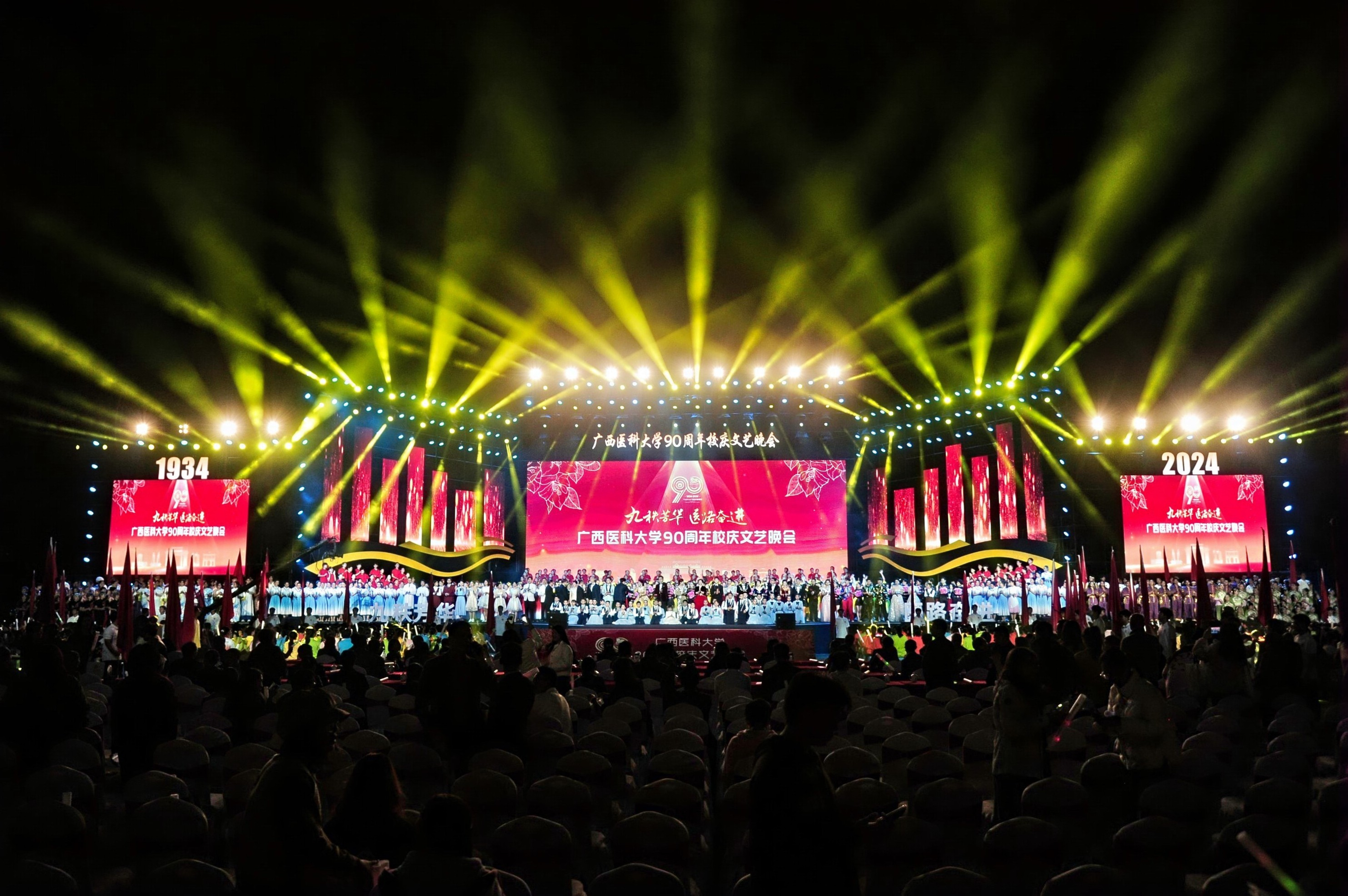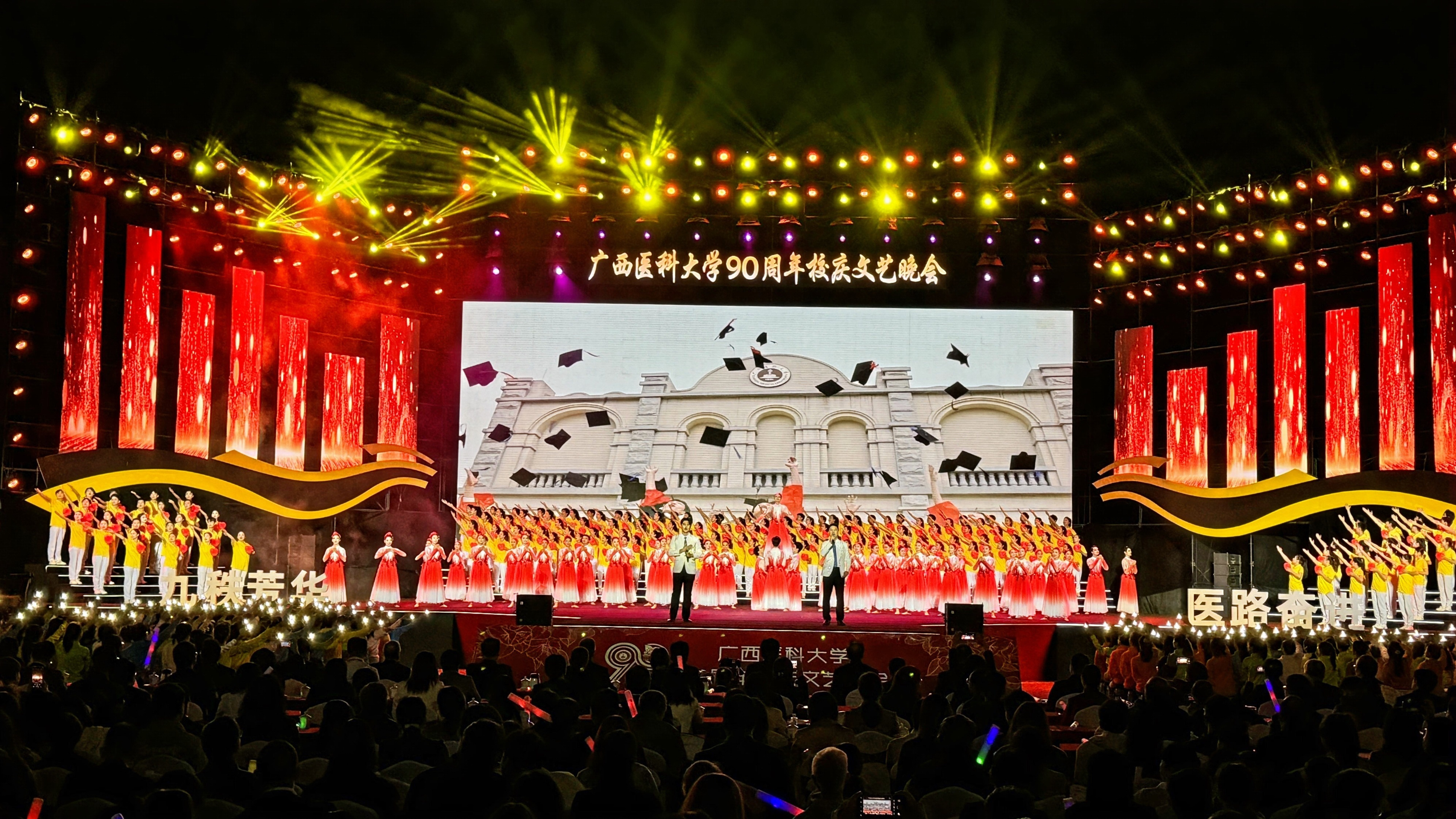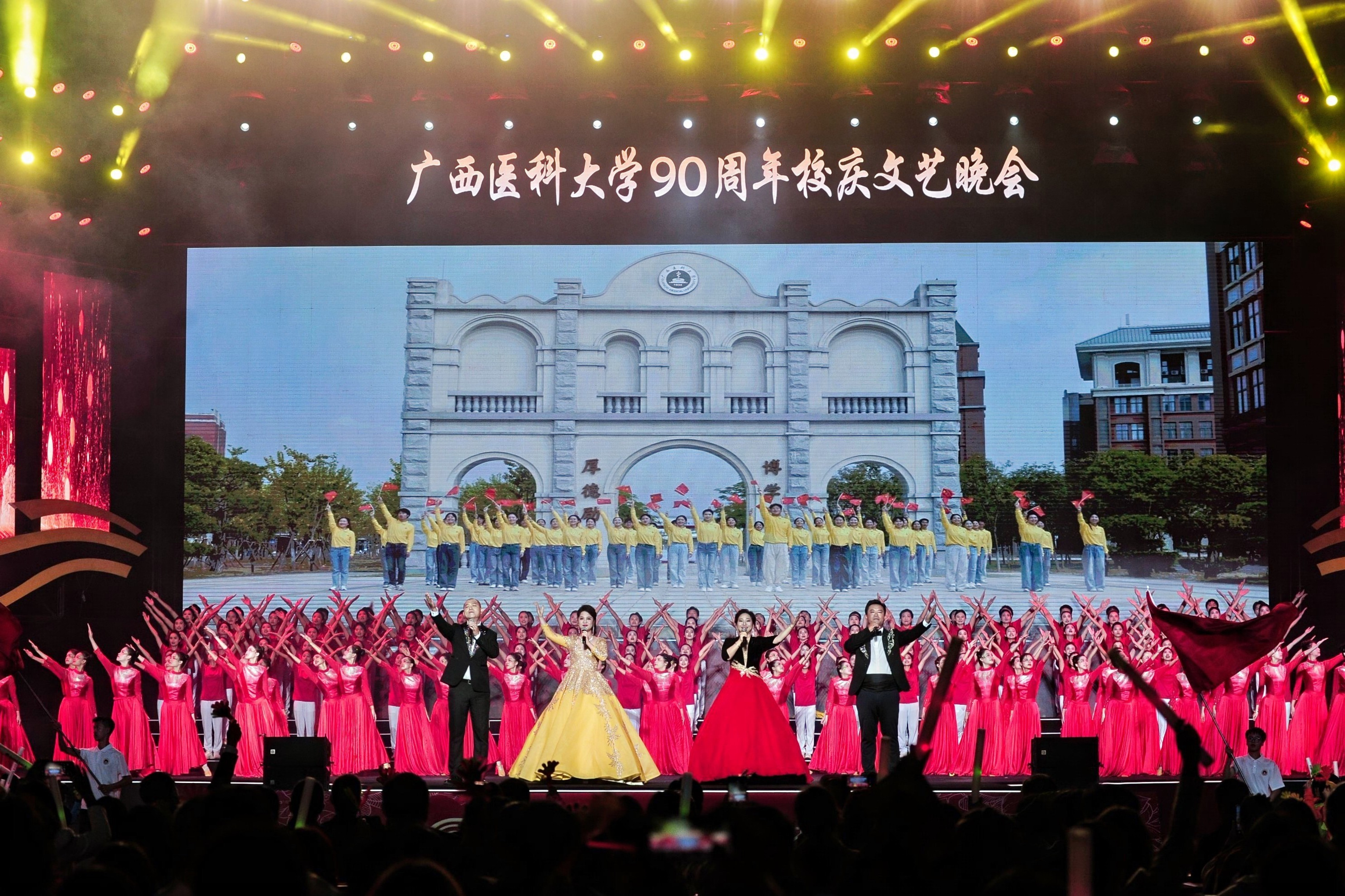 11月21日晚,“九秩芳华 医路奋进”广西医科大学90周年校庆文艺晚会在南宁-武鸣校区田径场举行。学校校领导出席晚会,学校处级干部、教职工代表、附属医院职工代表、离退休职工代表、各学院学生代表7200余人现场观看晚会。广西广播电视台、广西日报、南国早报、广西云等平台全球同步直播。全校师生员工、海内外校友和关心学校发展的各界人士在现场和云端共庆广西医科大学九秩华诞。