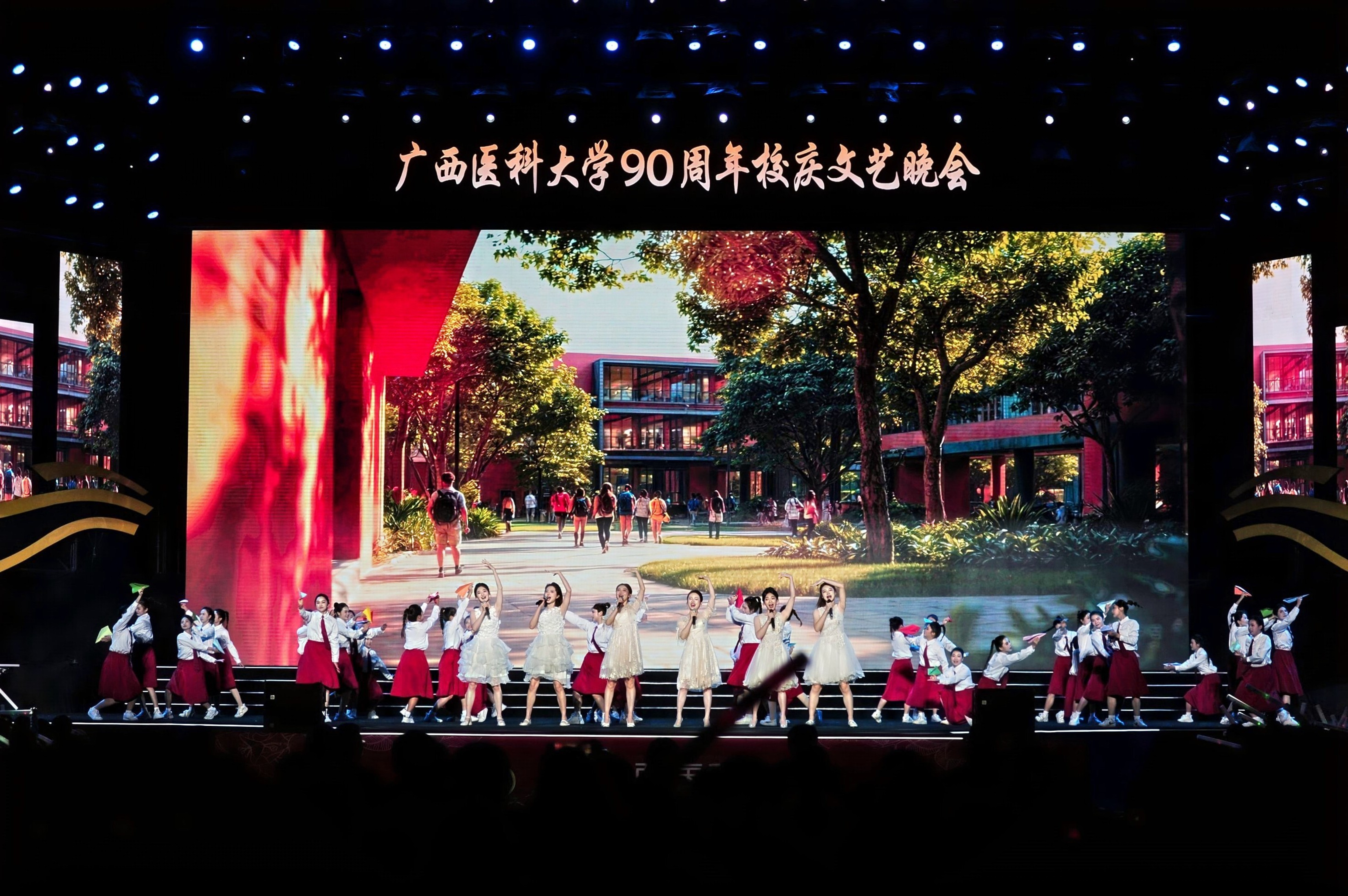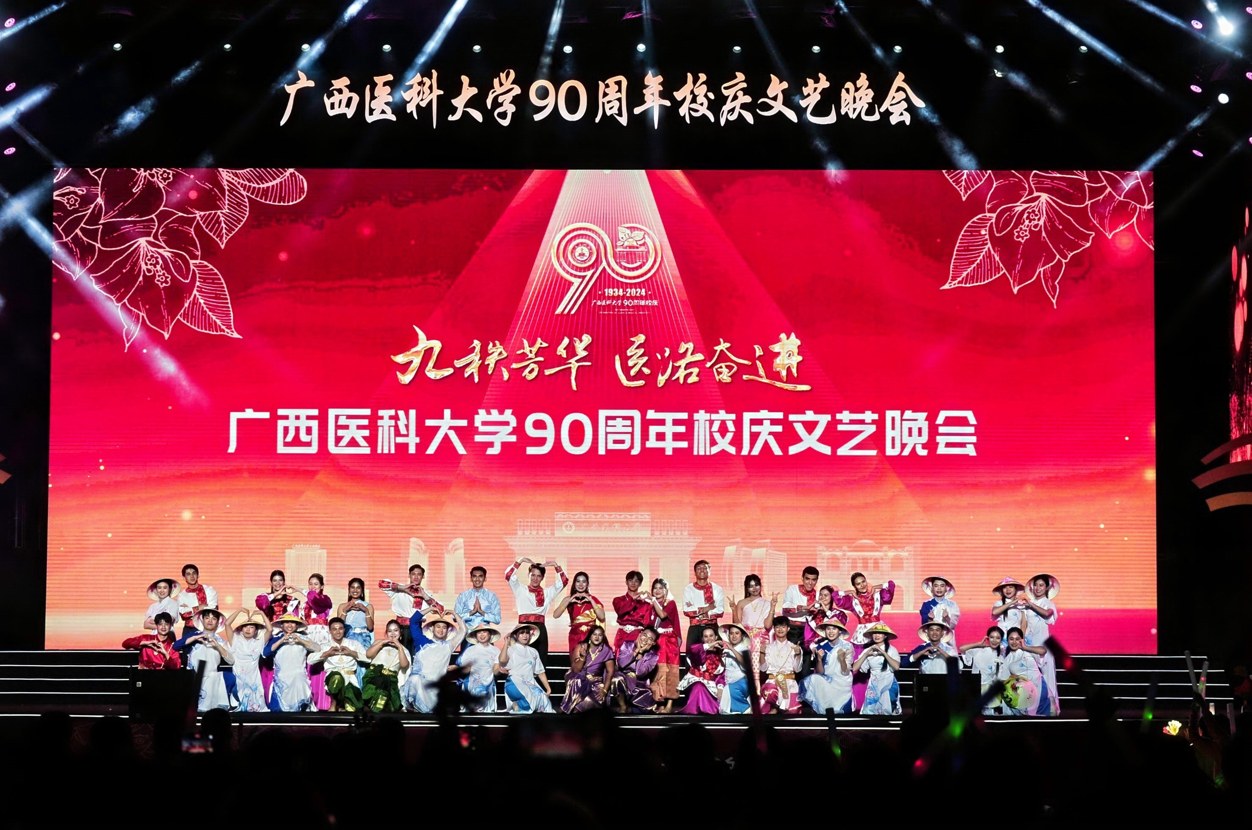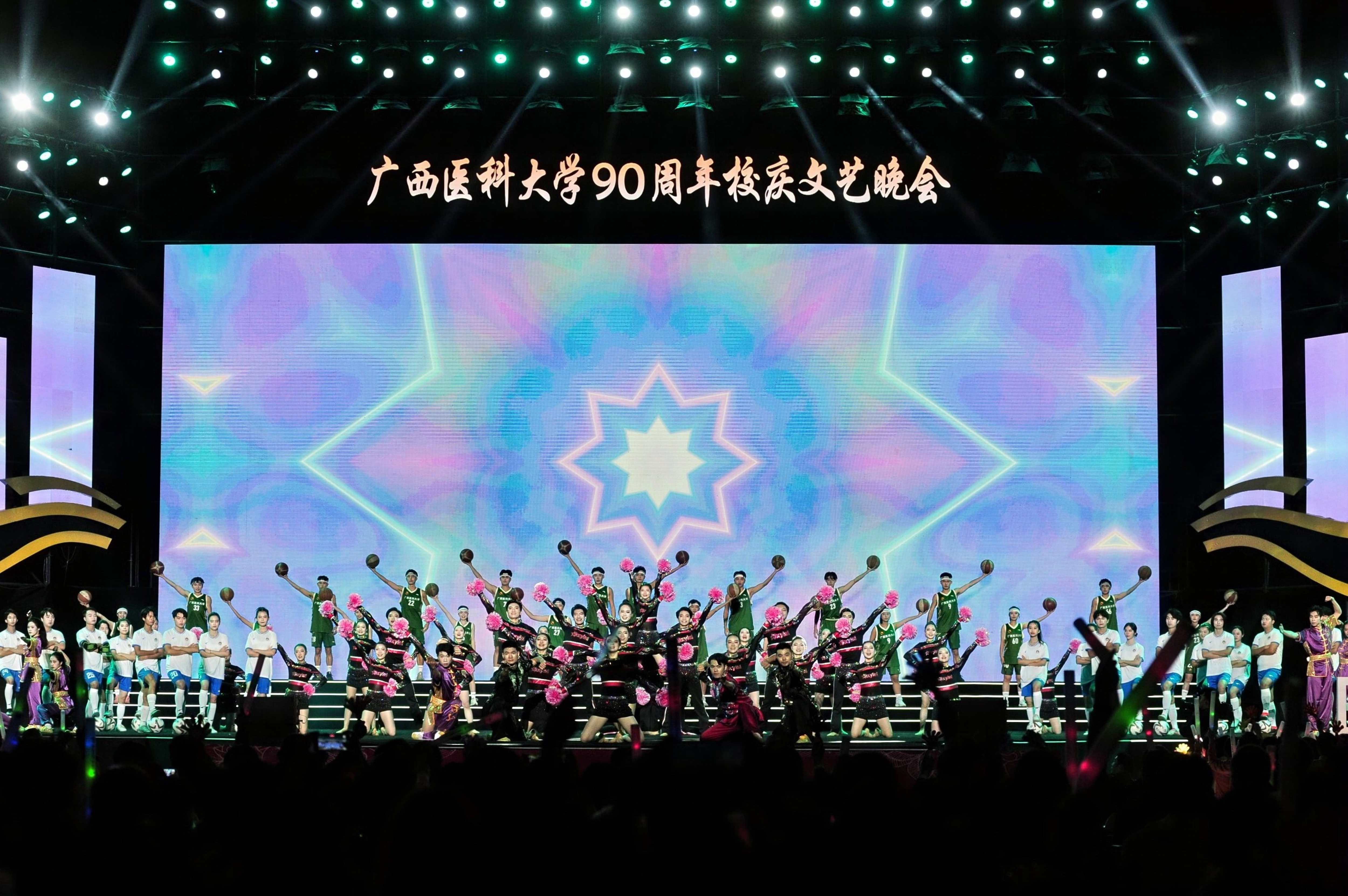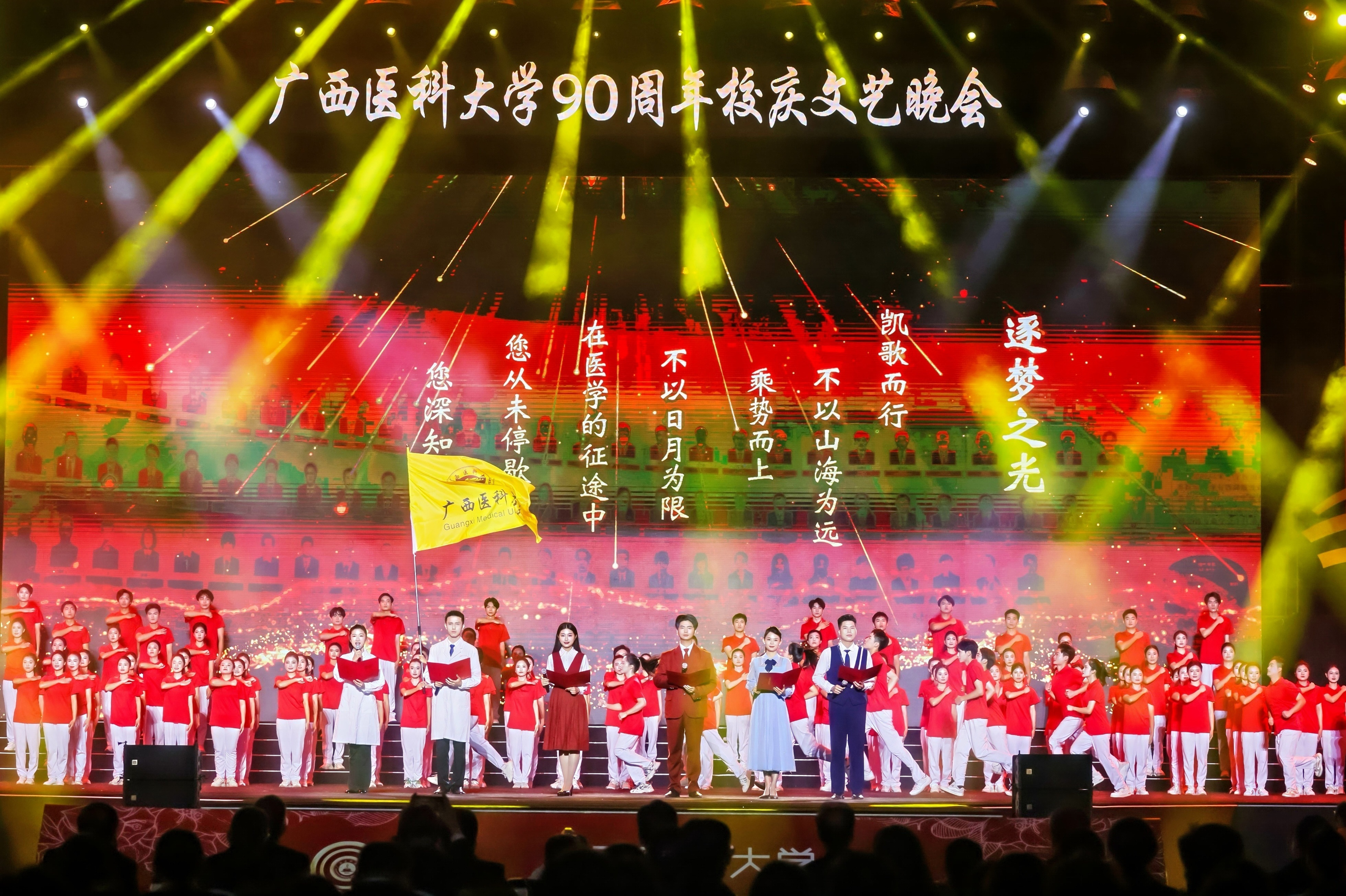 11月21日晚,“九秩芳华 医路奋进”广西医科大学90周年校庆文艺晚会在南宁-武鸣校区田径场举行。学校校领导出席晚会,学校处级干部、教职工代表、附属医院职工代表、离退休职工代表、各学院学生代表7200余人现场观看晚会。广西广播电视台、广西日报、南国早报、广西云等平台全球同步直播。全校师生员工、海内外校友和关心学校发展的各界人士在现场和云端共庆广西医科大学九秩华诞。