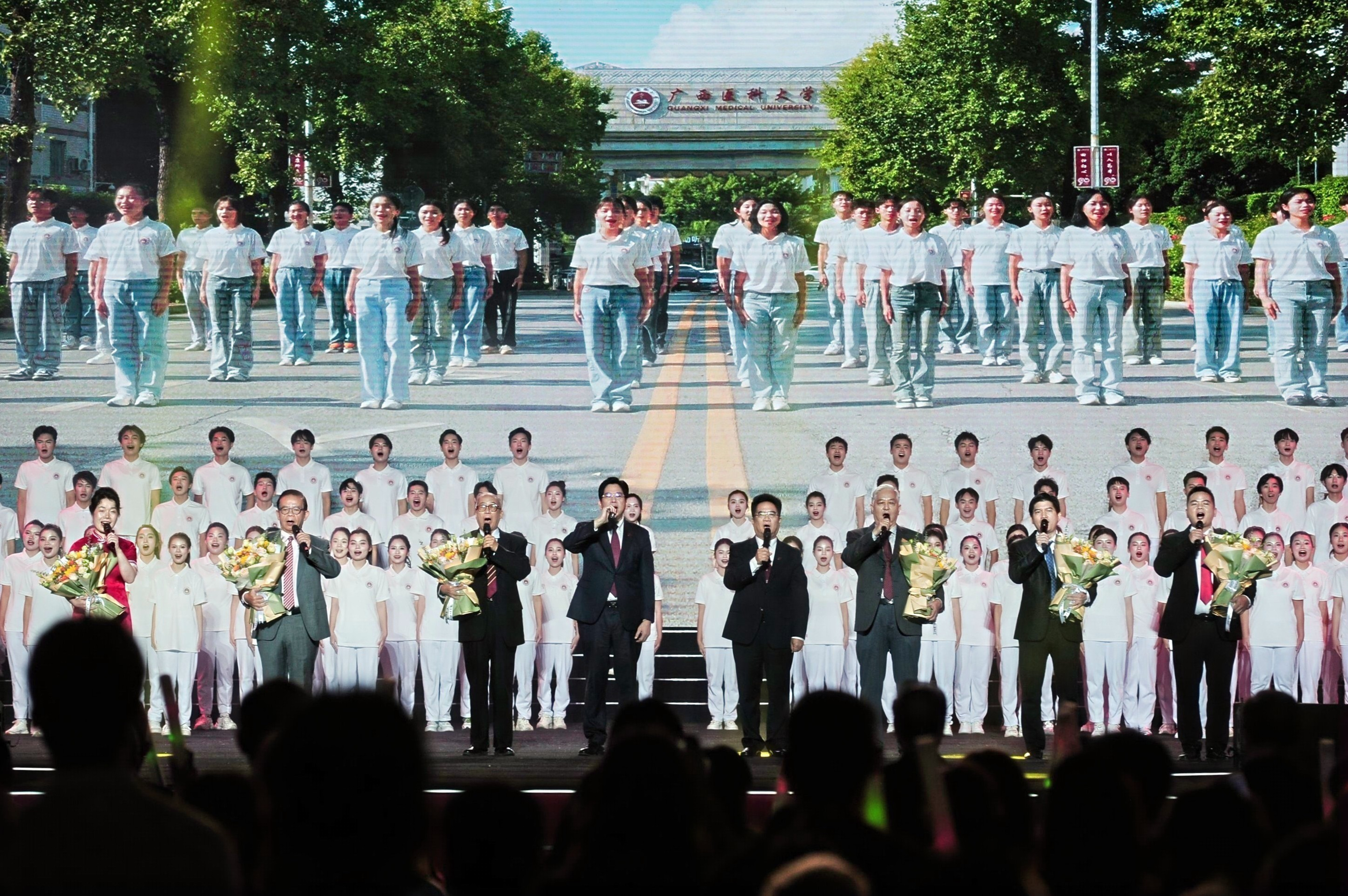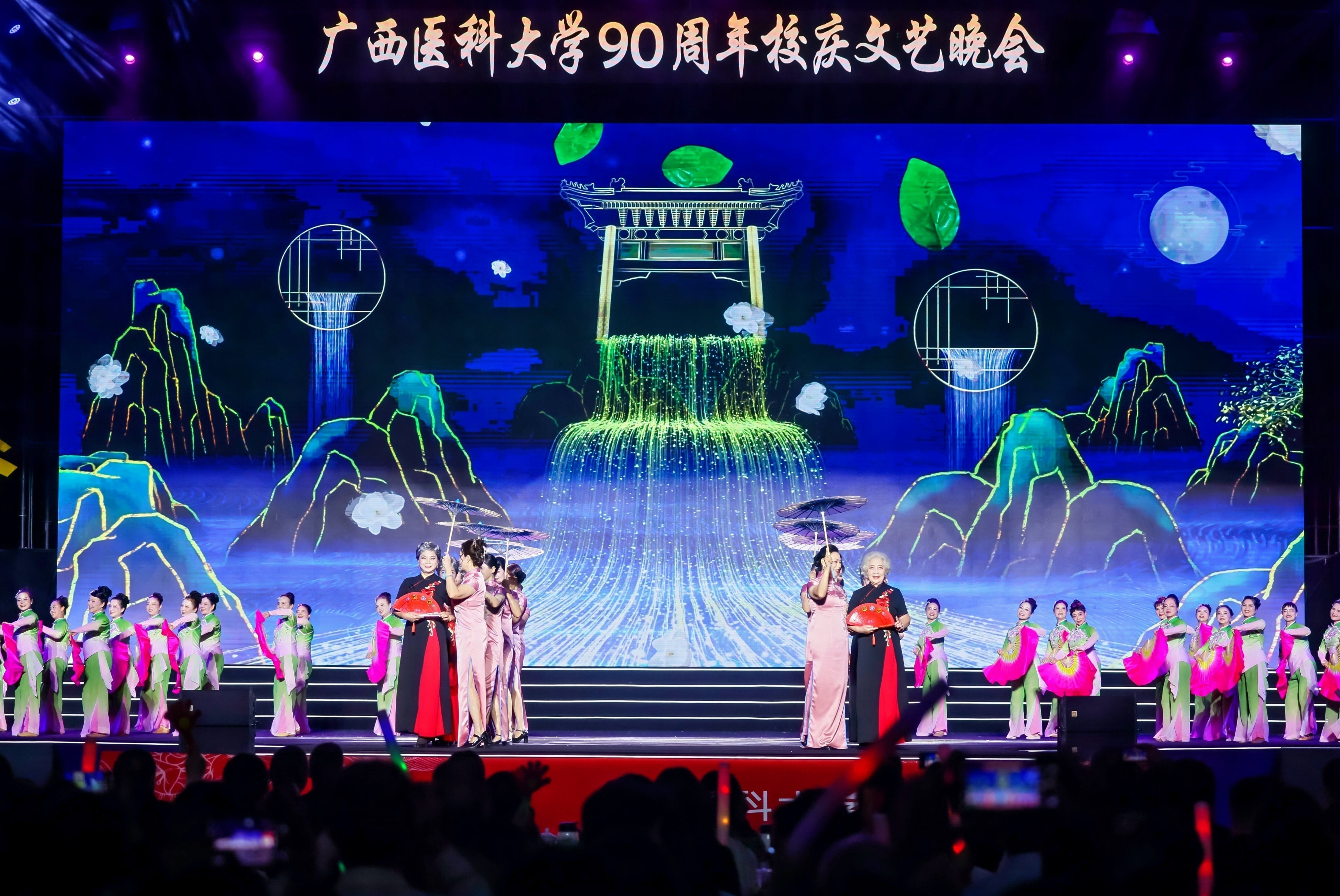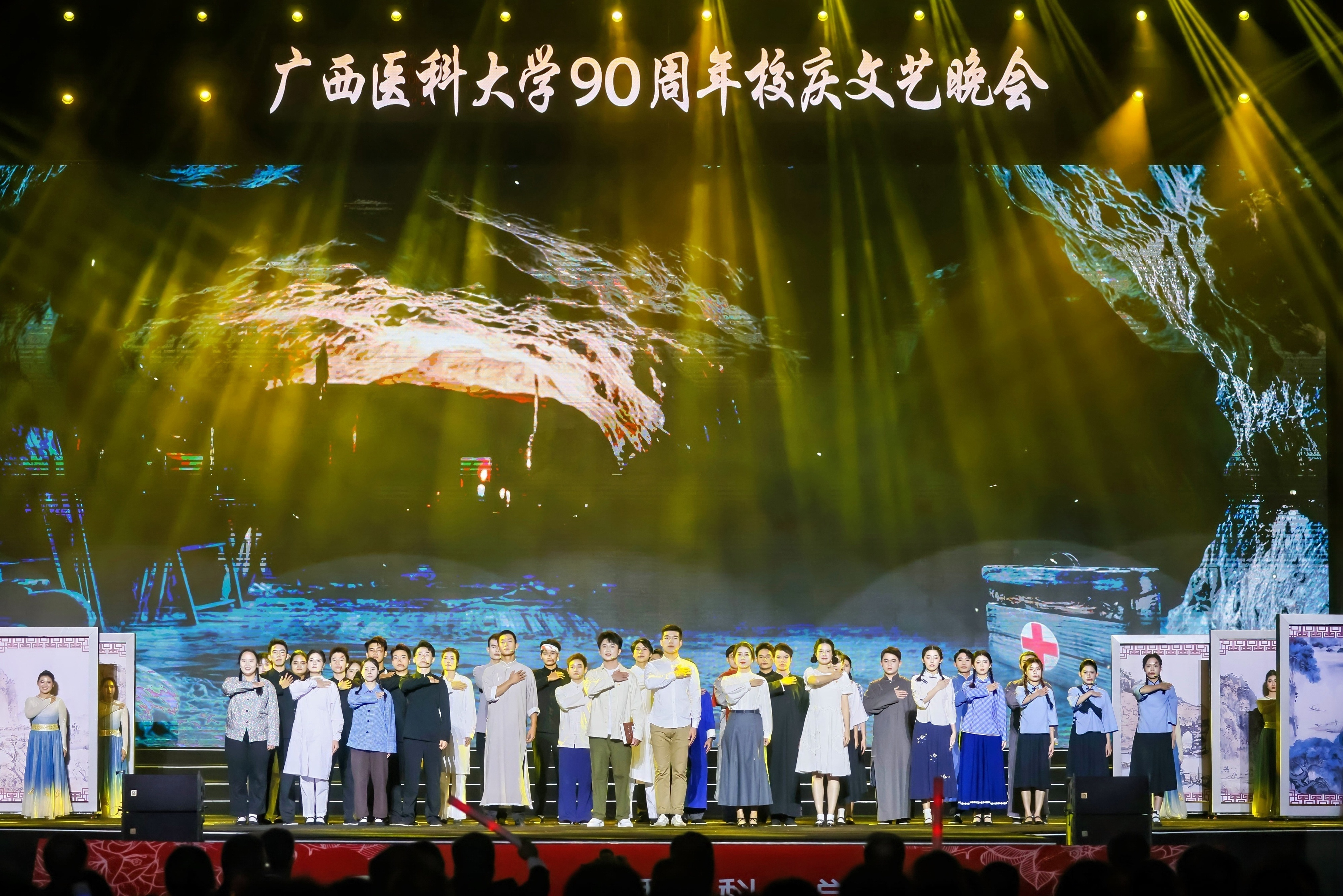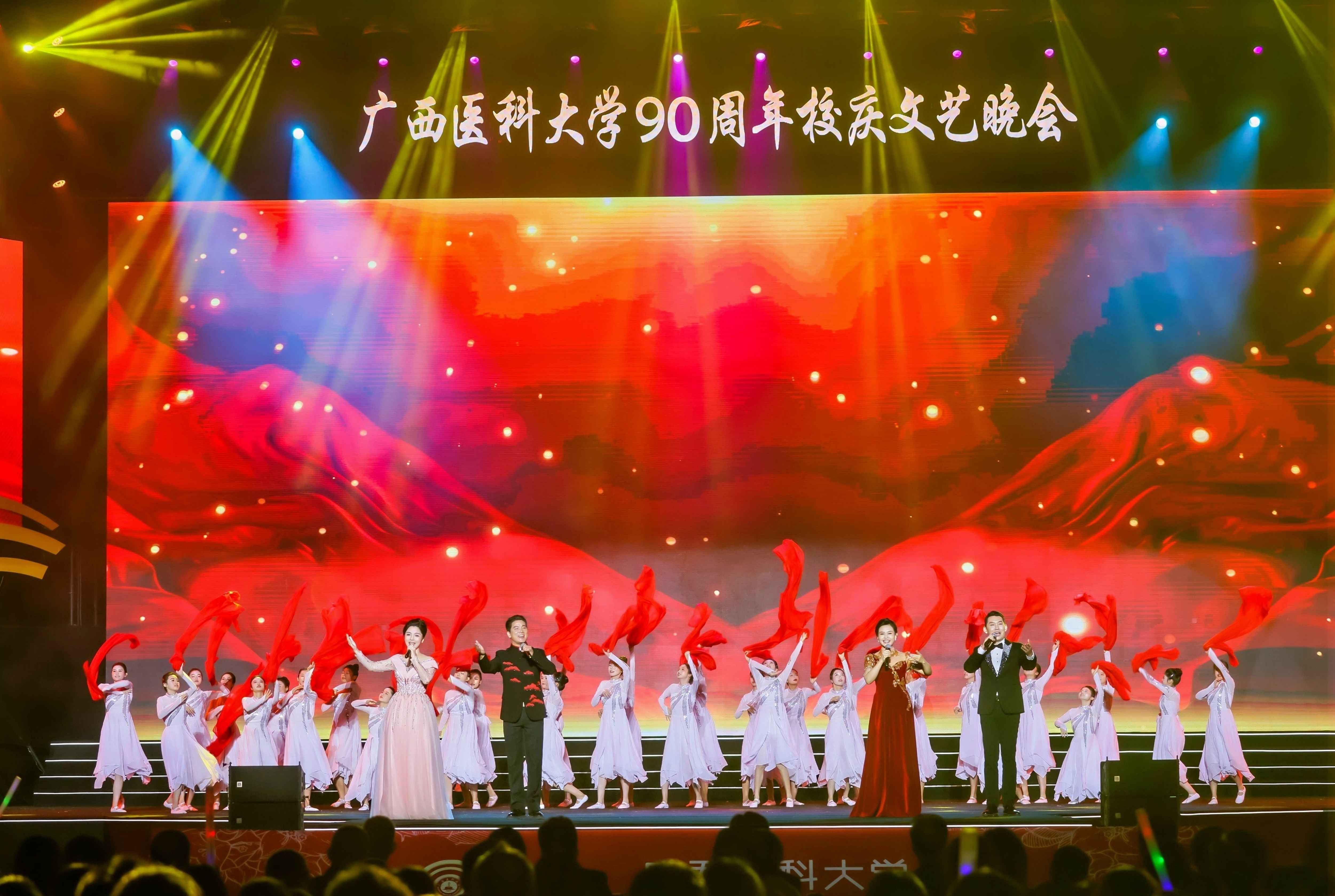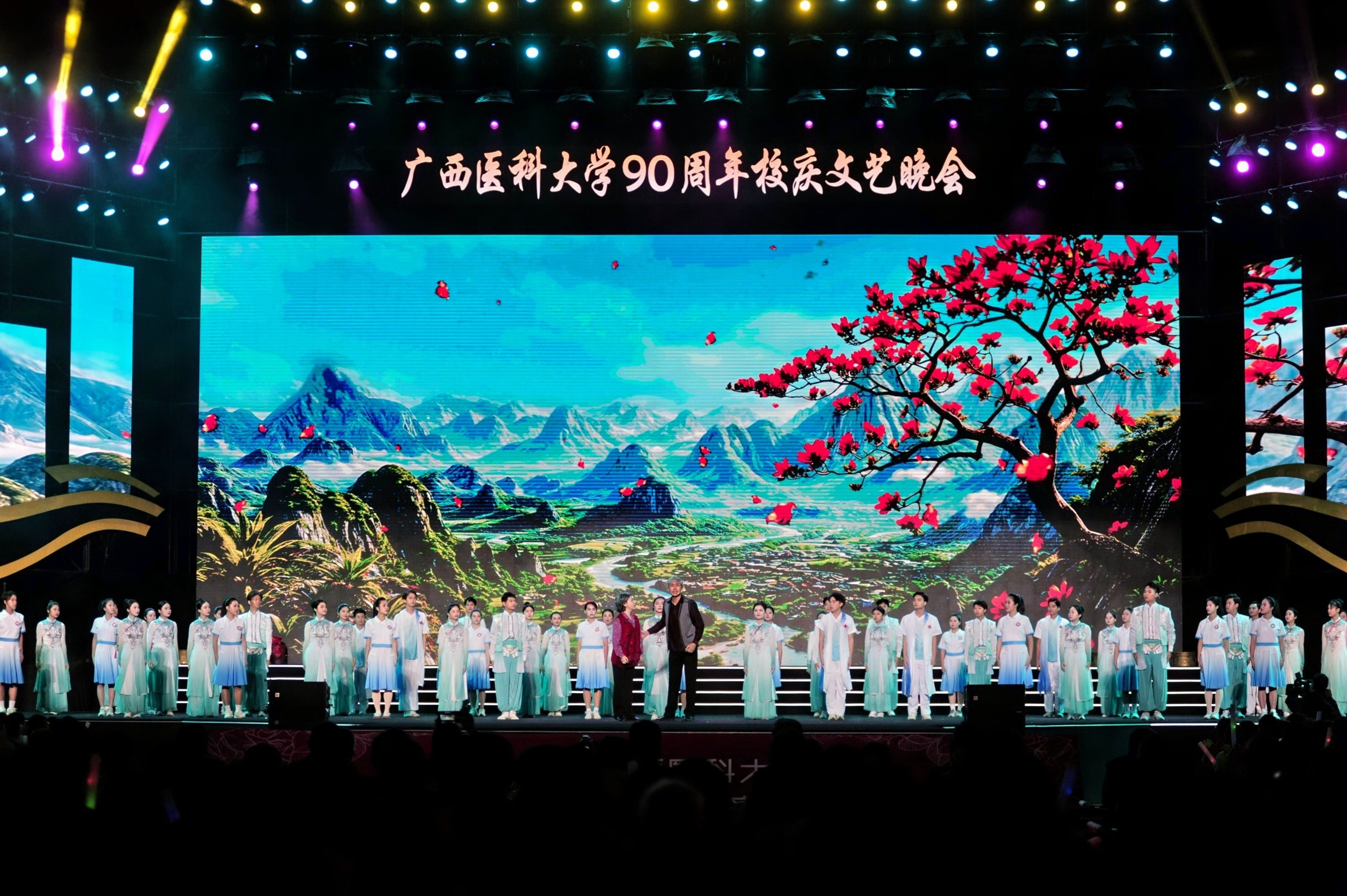 11月21日晚,“九秩芳华 医路奋进”广西医科大学90周年校庆文艺晚会在南宁-武鸣校区田径场举行。学校校领导出席晚会,学校处级干部、教职工代表、附属医院职工代表、离退休职工代表、各学院学生代表7200余人现场观看晚会。广西广播电视台、广西日报、南国早报、广西云等平台全球同步直播。全校师生员工、海内外校友和关心学校发展的各界人士在现场和云端共庆广西医科大学九秩华诞。