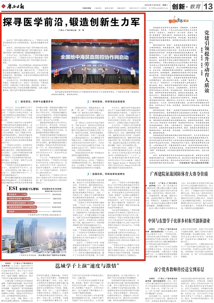 2024年11月26日,《广西日报》在第013版创新·教育专栏刊发题为《探寻医学前沿,锻造创新生力军》的文章,展现广西医科大学聚焦高质量发展,高度重视学科建设、科技创新工作,坚持以一流为目标,开展有组织科研,科技创新工作多点突破、成果显著的工作成果。