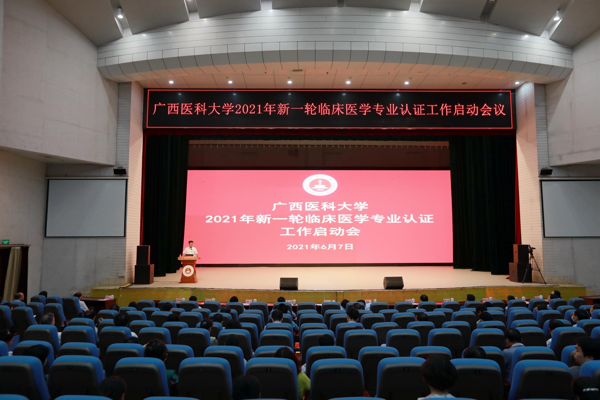 6月7日下午,学校在图书演讲厅召开新一轮临床医学专业认证工作启动会。学校党委书记黄照权、校长赵劲民、全体校领导、中层干部出席启动会,各二级学院、附属医院教研科室、教学人员参加会议,各非直属附属医院设网络分会场。会议由副校长伍伟锋主持。