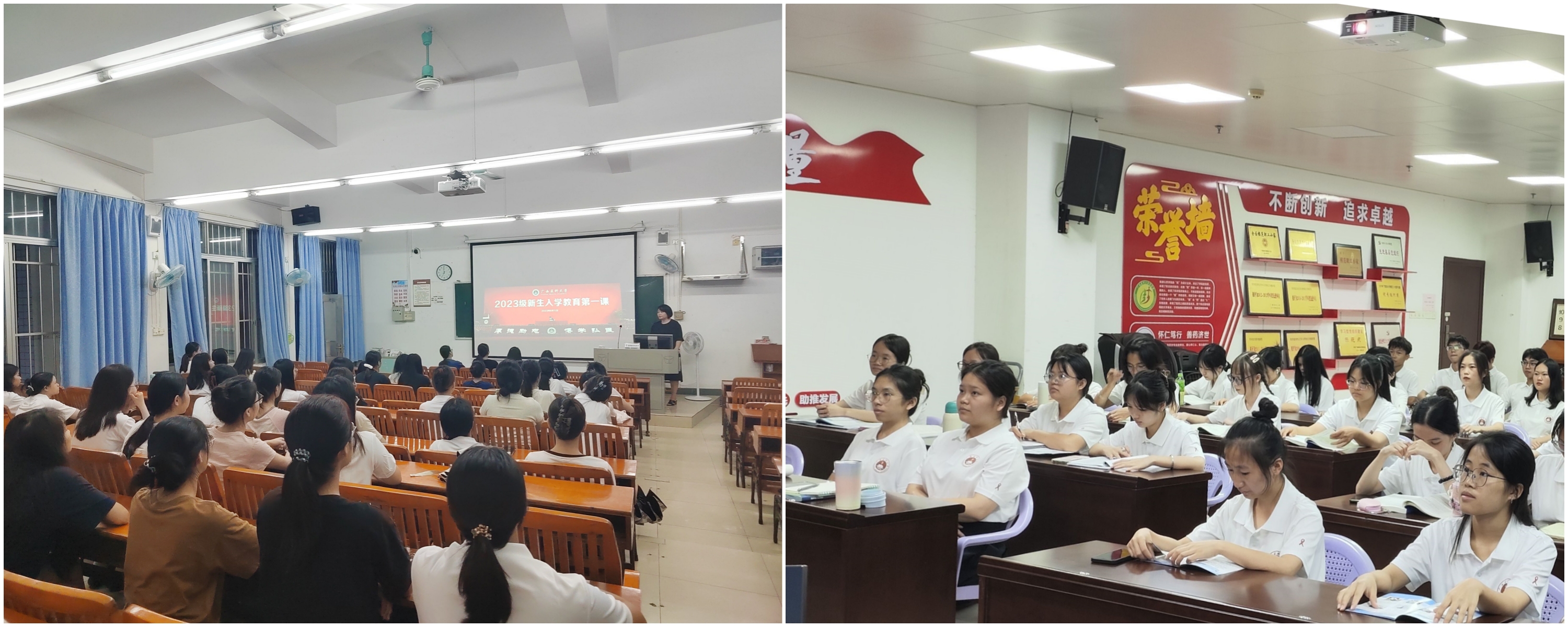 ▲南宁-校本部护理学院、药学院分会场师生认真聆听入学教育第一课
