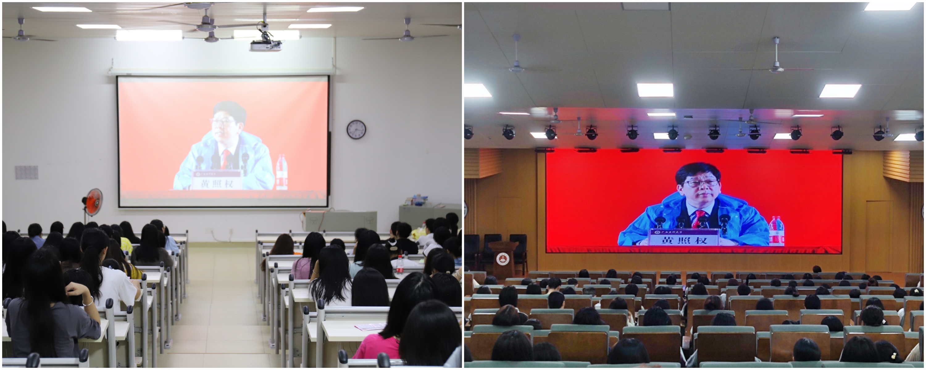 在南宁-武鸣校区,学生工作部(处)与相关职能部处、各学院的主要负责人,以及玉林校区老师代表,2023级新生全体辅导员和班主任共同聆听了本次课程。