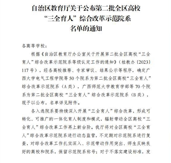 【喜讯】我校四个学院入选第二批全区高校“三全育人”综合改革示范院系