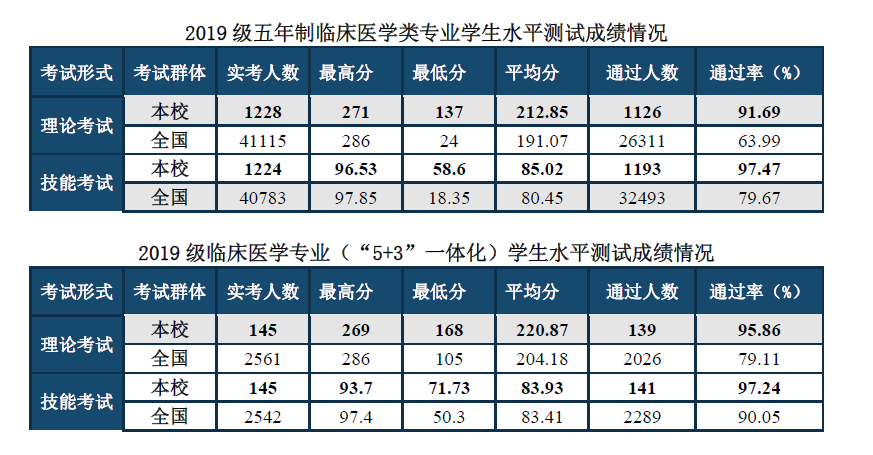 我校2019级临床医学类专业学生参加2023年水平测试再获佳绩。其中,五年制临床医学、麻醉学、医学影像学、儿科学、精神医学专业学生的医学基本知识考试(理论考试)通过率超出全国平均水平27.7个百分点,临床基本技能考试通过率超出全国平均水平17.8个百分点。临床医学专业(“5+3”一体化)学生的医学基本知识考试(理论考试)通过率超出全国平均水平16.75个百分点,临床基本技能考试通过率超出全国平均水平7.19个百分点。