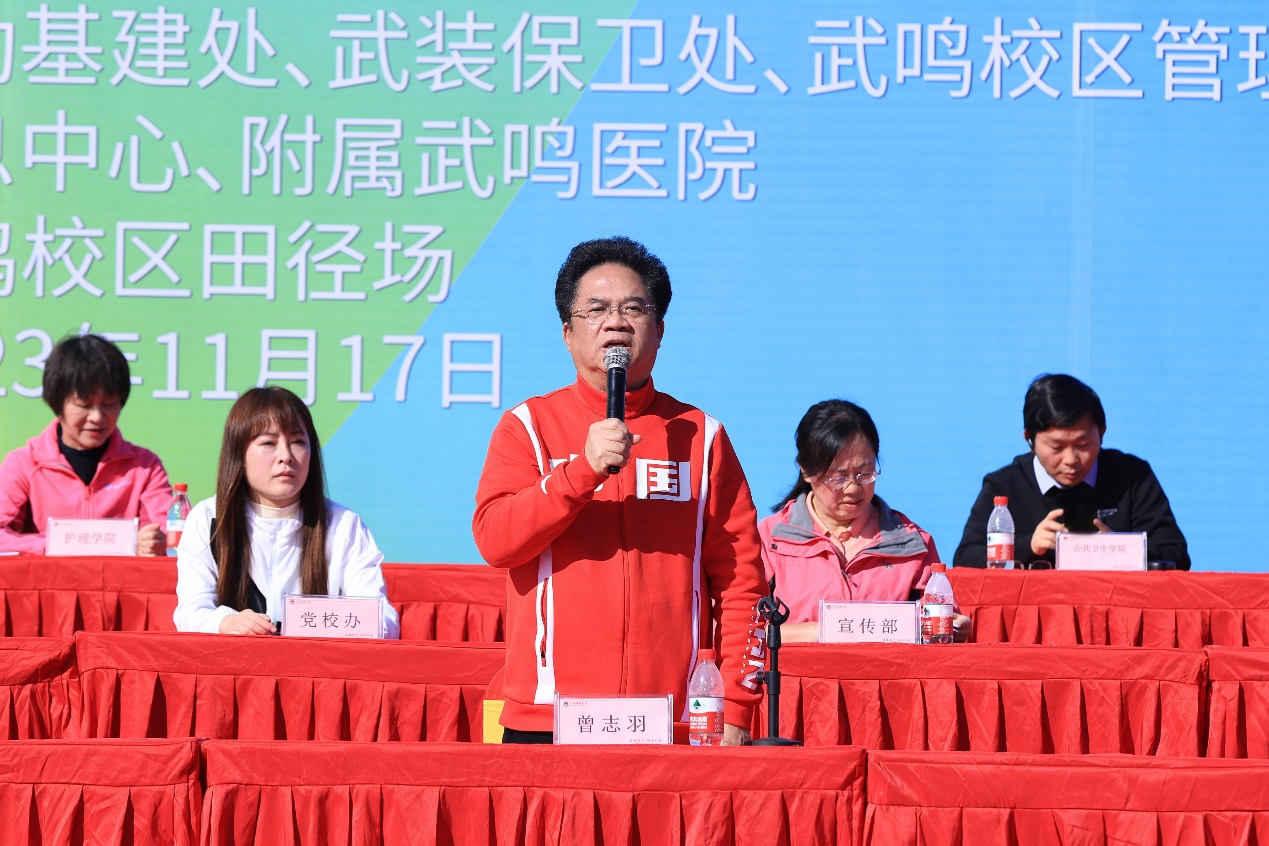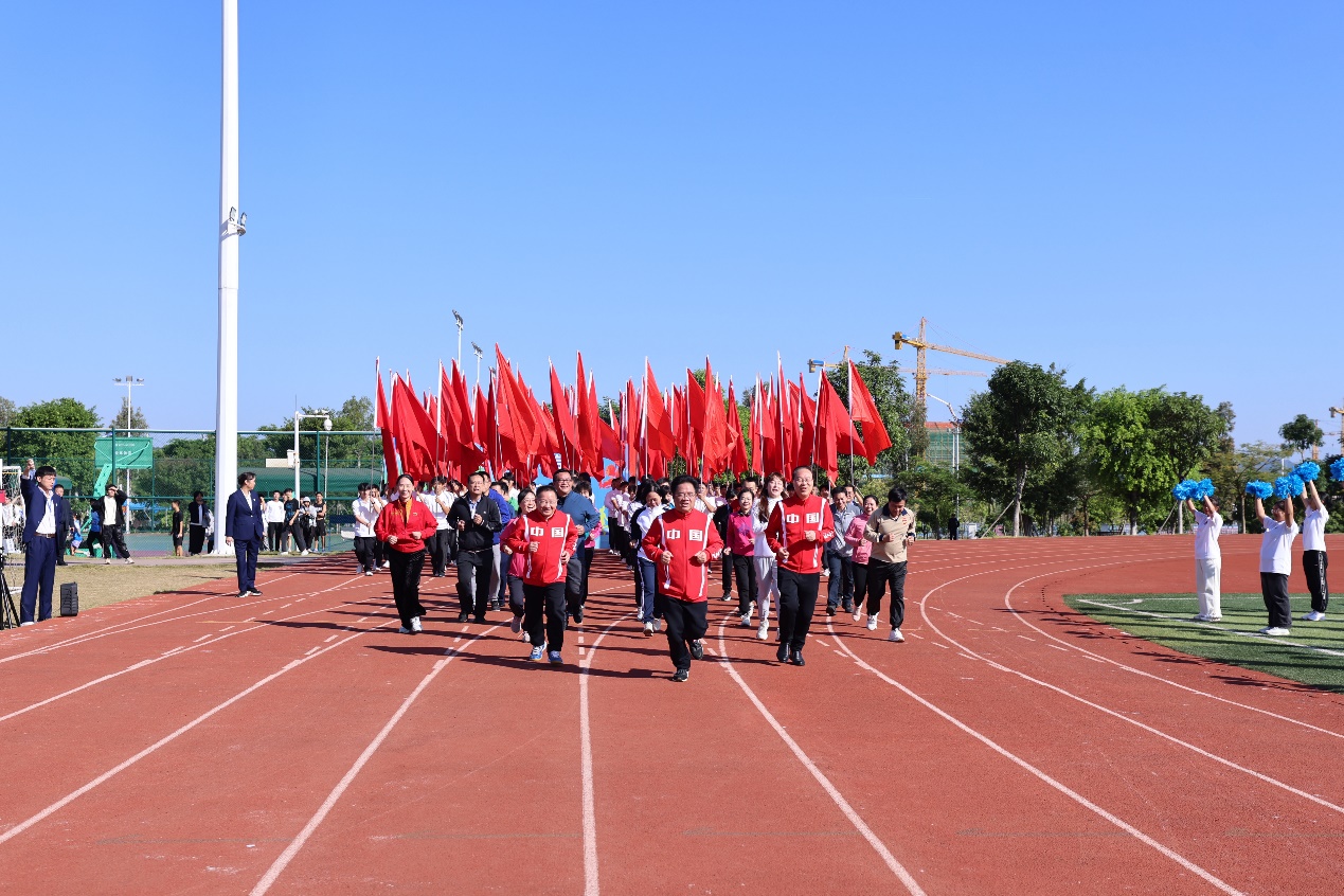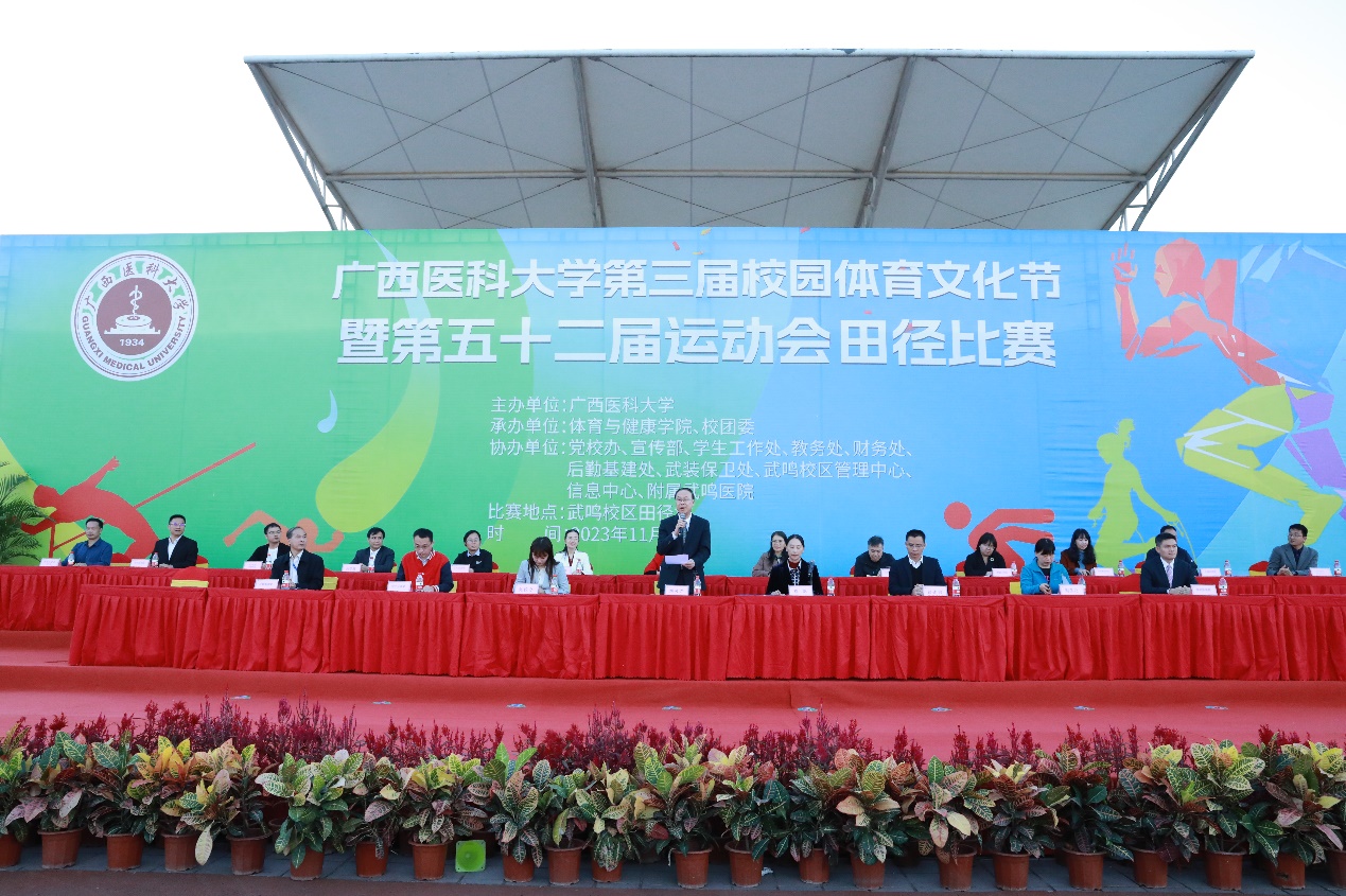 秋暮冬初,暖阳正好。11月17日上午,我校第五十二届运动会田径比赛在武鸣校区拉开序幕。学校校长曾志羽、党委副书记刘灵光,党委常委、副校长卢德成、陈俊强,以及学校各职能部门、二级学院负责人出席了开幕式。曾志羽校长宣布运动会开幕,陈俊强副校长致辞,体育与健康学院院长穆飒主持开幕式。