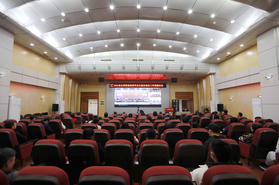 我校在南宁-校本部综合楼9楼报告厅设立分会场,学校校长曾志羽、副校长陈兴才出席会议,学工部、武装部的主要领导和研工部、高职院、玉林校区及各相关学院主要负责同志、分管就业工作的院领导和负责2024届毕业生就业工作的辅导员及招生就业处全体成员参加会议。