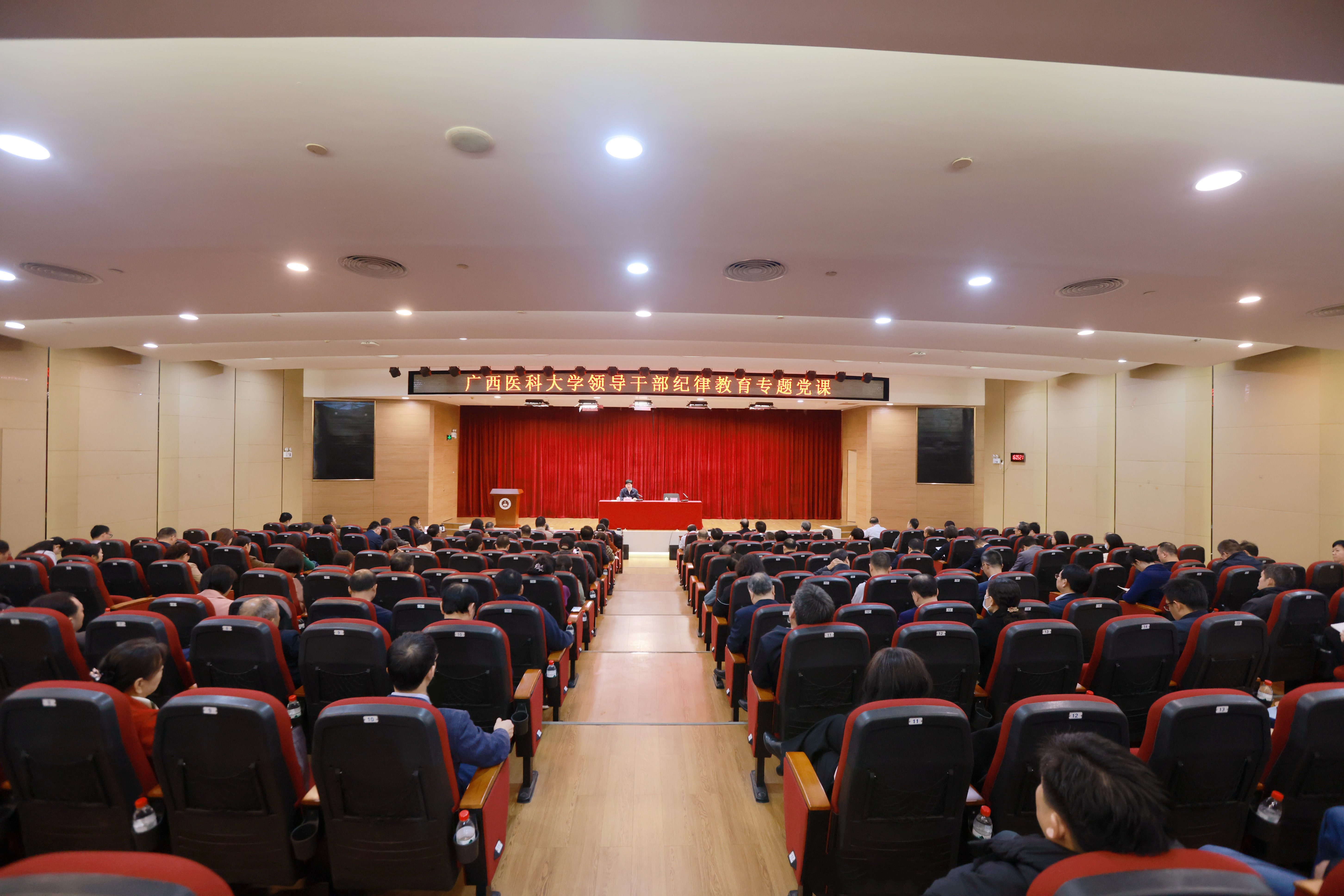 根据自治区纪委机关、教育工委《关于在全区高校开展“加强纪律教育,建设清廉学校”系列活动的方案》部署,按照全区高校党员领导干部警示教育大会精神要求,为进一步增强学校领导干部政治意识、规矩意识、纪律意识、法律意识和底线意识,12月6日下午,黄照权书记走上讲台,为广西医科大学领导干部讲授纪律教育专题党课。