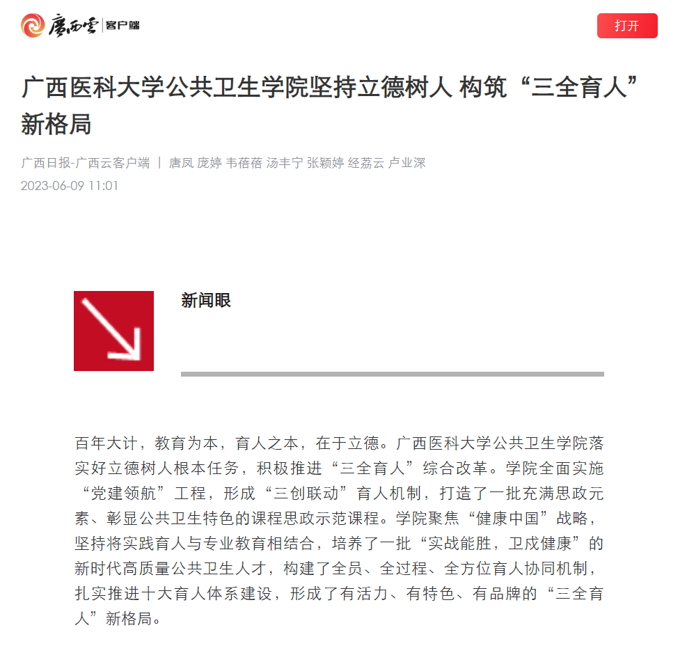 近日,《广西日报》报道了我校公共卫生学院落实好立德树人根本任务,积极推进“三全育人”综合改革。学院全面实施“党建领航”工程,形成“三创联动”育人机制,打造了一批充满思政元素、彰显公共卫生特色的课程思政示范课程。学院聚焦“健康中国”战略,坚持将实践育人与专业教育相结合,培养了一批“实战能胜,卫戍健康”的新时代高质量公共卫生人才,构建了全员、全过程、全方位育人协同机制,扎实推进十大育人体系建设,形成了有活力、有特色、有品牌的“三全育人”新格局。