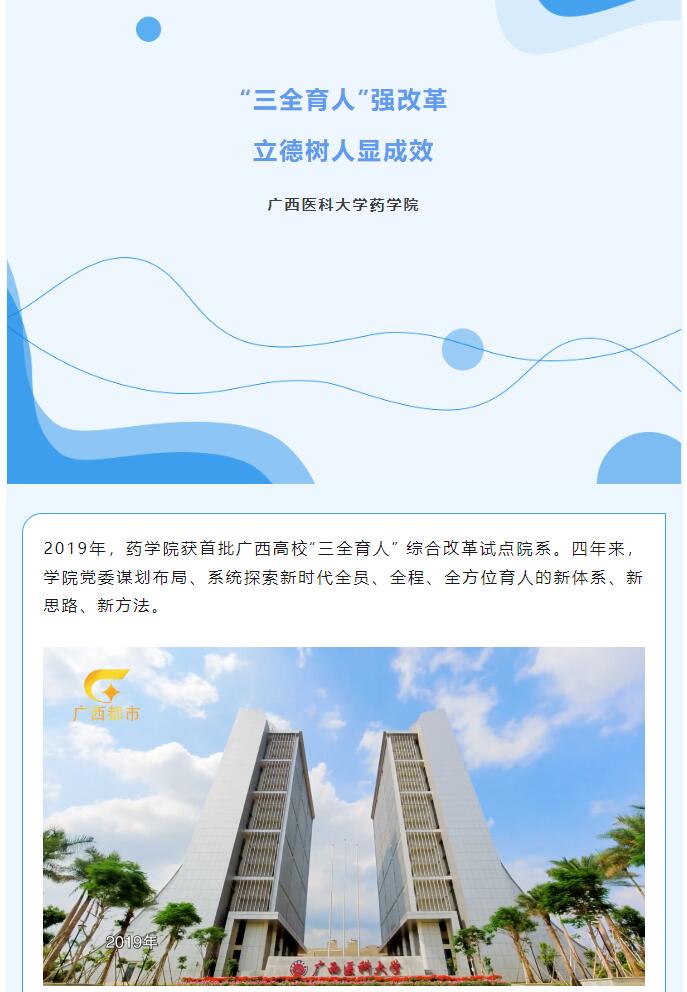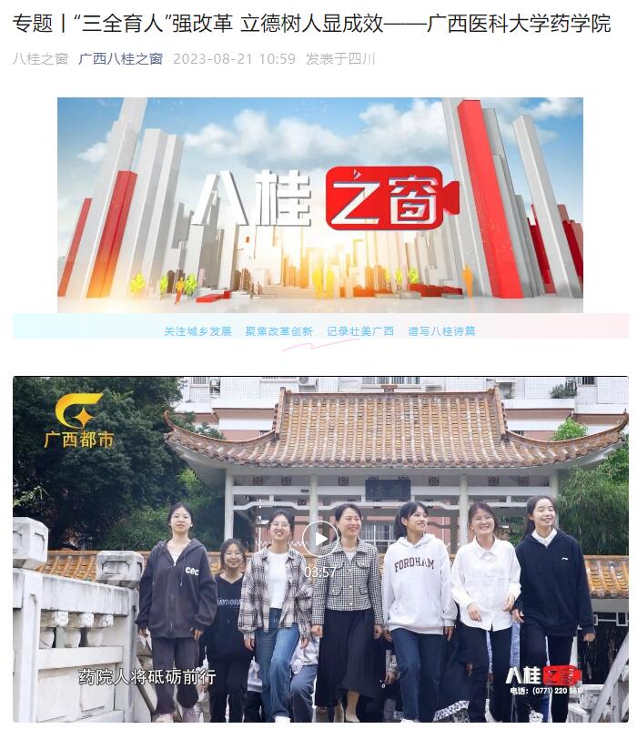 近日,广西广播电视台都市频道报道了广西医科大学药学院党建工作成效:“三全育人”强改革 立德树人显成效——广西医科大学药学院。