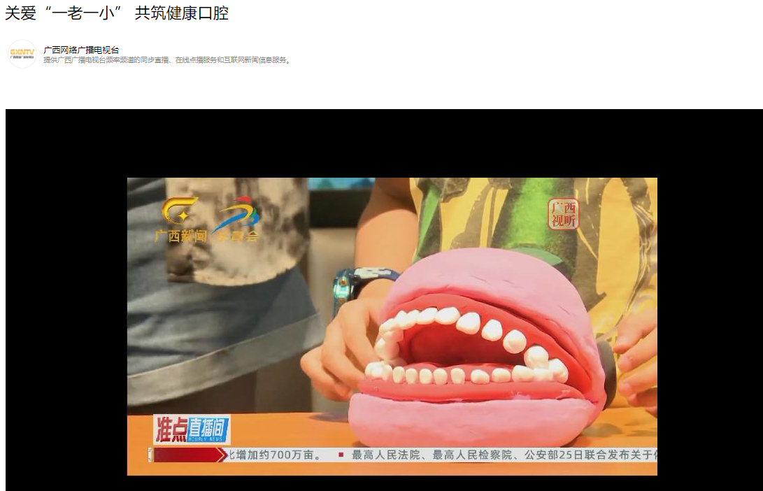 9月24日,广西口腔医学会主办与广西医科大学附属口腔医院承办联合举办了以“口腔健康 全身健康”为主题,以“关爱老年口腔 乐享健康生活”为副主题的“9·20全国爱牙日”暨恒牙全脱出自我急救技术大比拼活动。广西网络广播电视台以《关爱“一老一小” 共筑健康口腔》为题,对活动进行了视频报道。