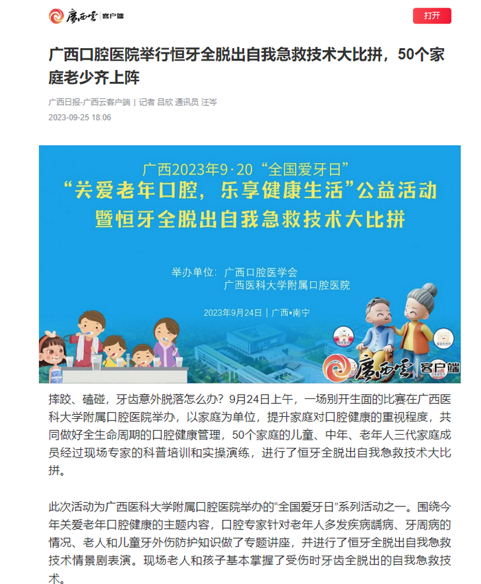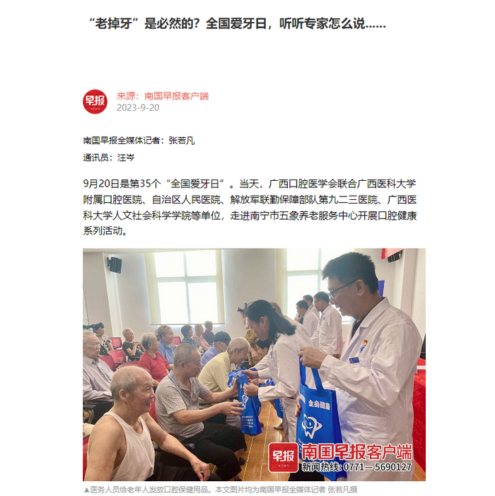 第35个“全国爱牙日”,广西口腔医学会、广西医科大学附属口腔医院联合兄弟单位,在区内开展了系列爱牙、健康宣教、义诊系列活动。新华网、广西日报、南国早报等区内外多家媒体先后对系列活动进行了报道。