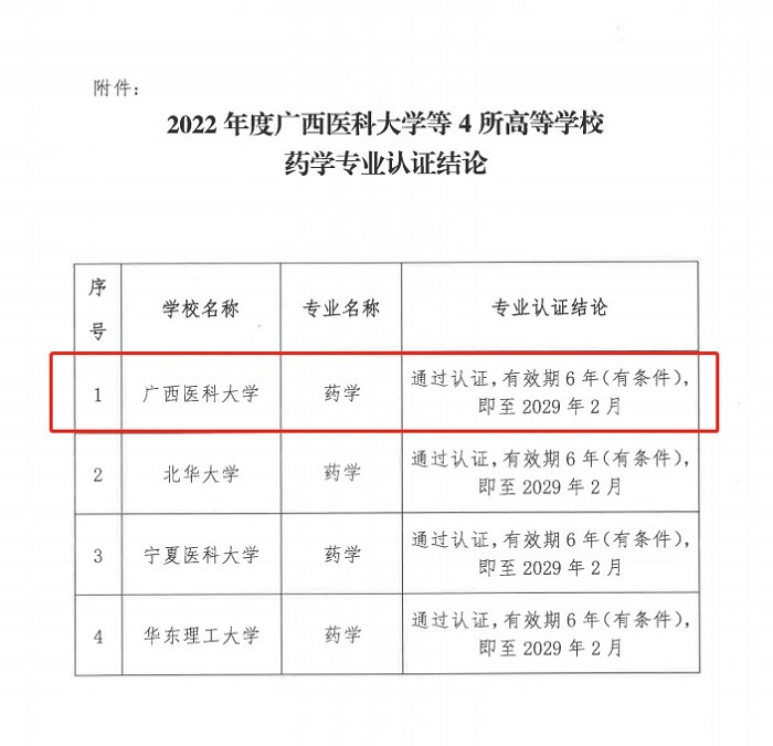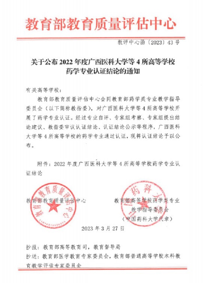 2023年3月27日,教育部教育质量评估中心会同教育部高等学校药学类专业教学指导委员会共同签发《关于公布2022年度广西医科大学等4所高等学校药学专业认证结论的通知》(教评中心函〔2023〕43号),对2022年度广西医科大学等4所高等学校药学专业认证结论进行公布。经过专业自评、专家组考察、专家组提出结论建议、教指委审议认证结论、认证结论公示等程序,我校药学专业顺利通过教育部专业认证,认证有效期6年(即至2029年2月)。